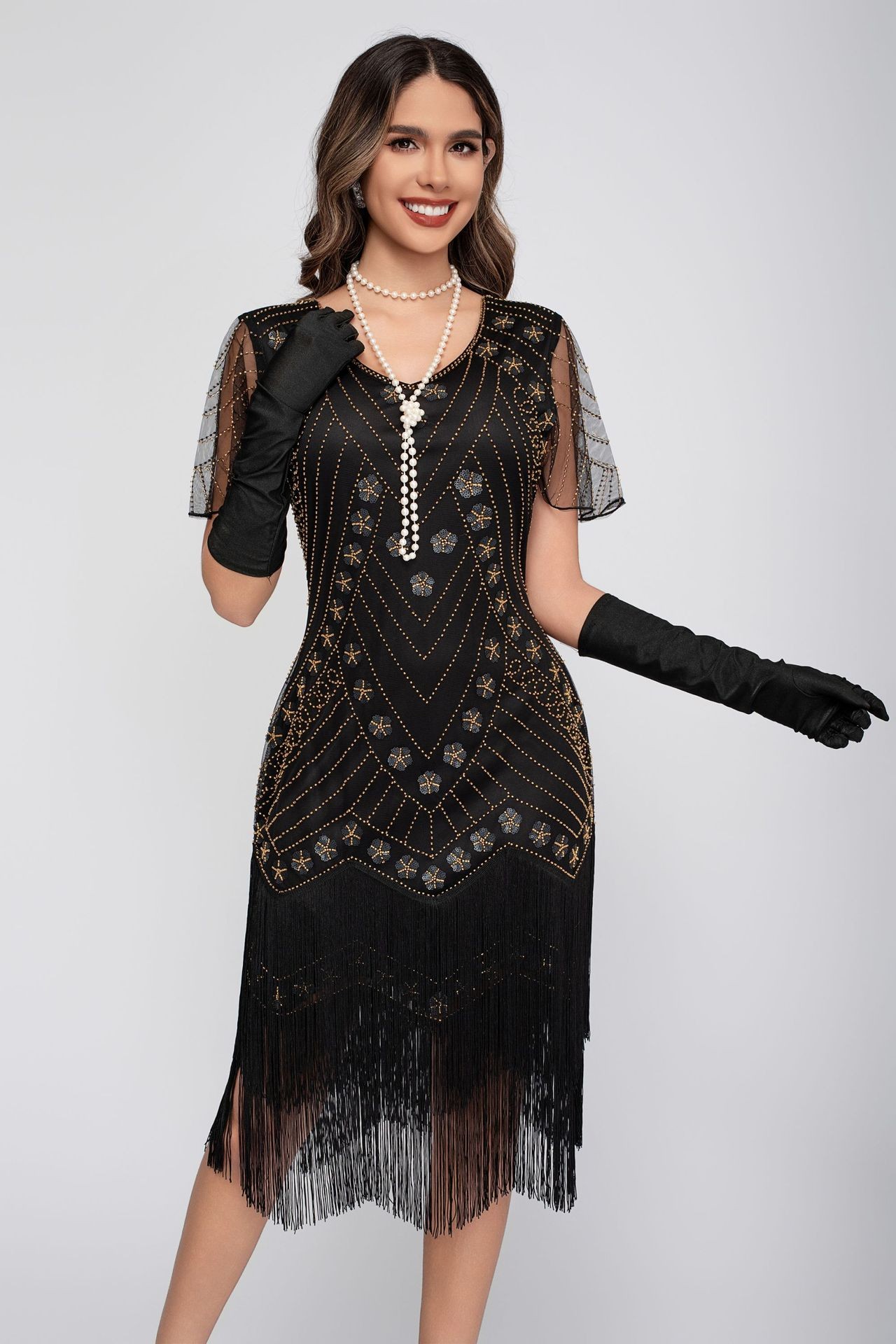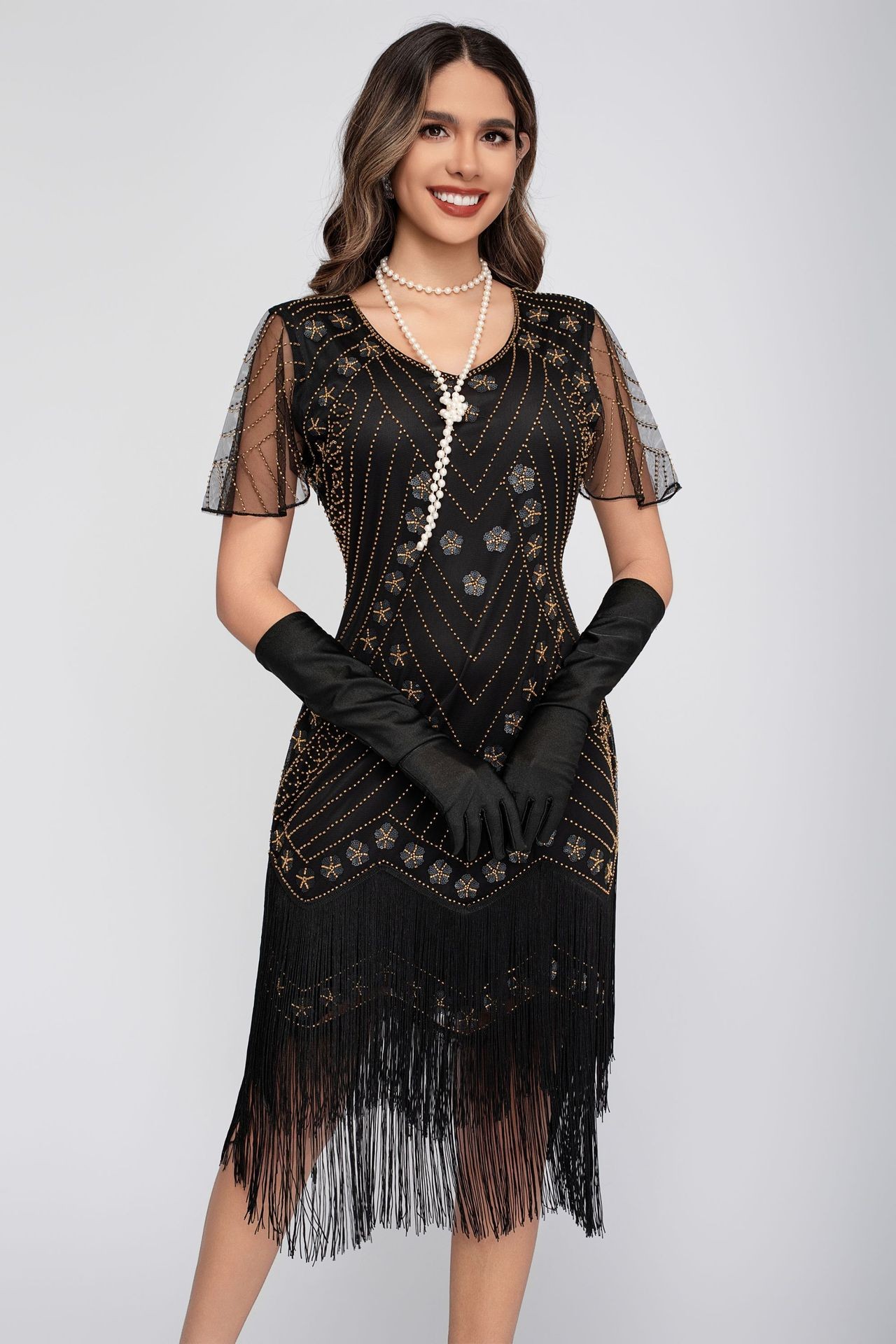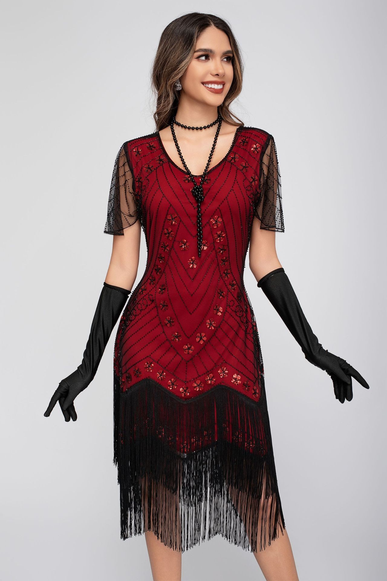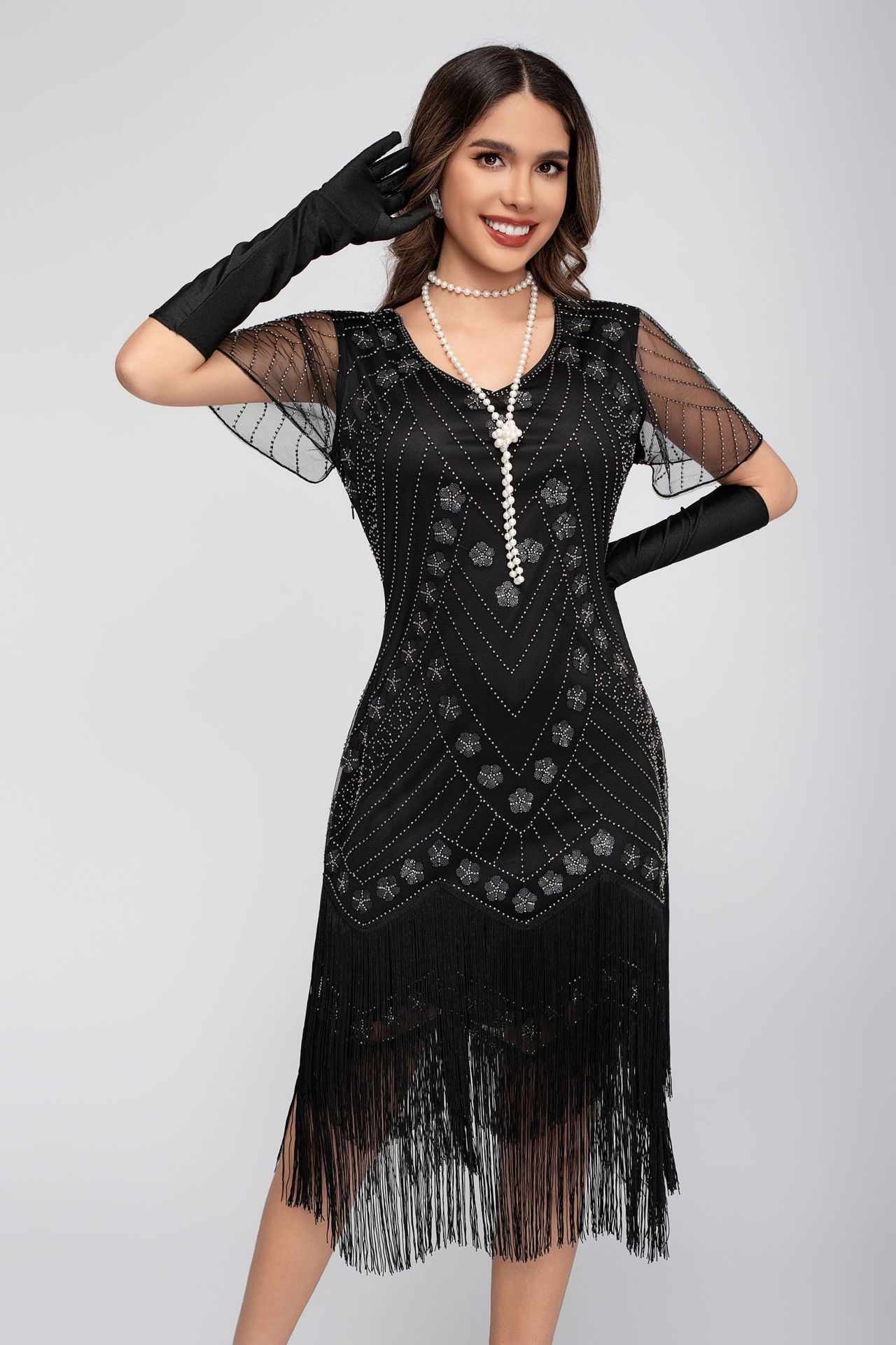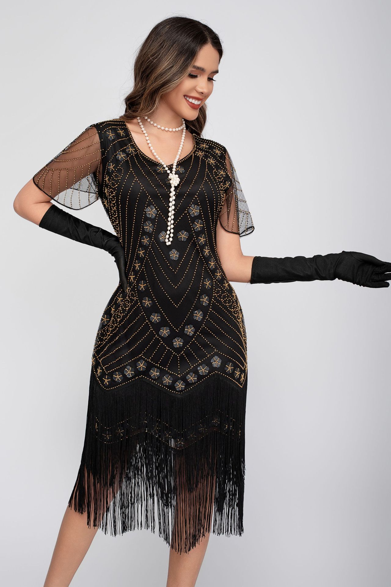 亮片流苏礼服裙1920欧美复古盖茨比舞会钉珠短袖连衣裙亚马逊跨境