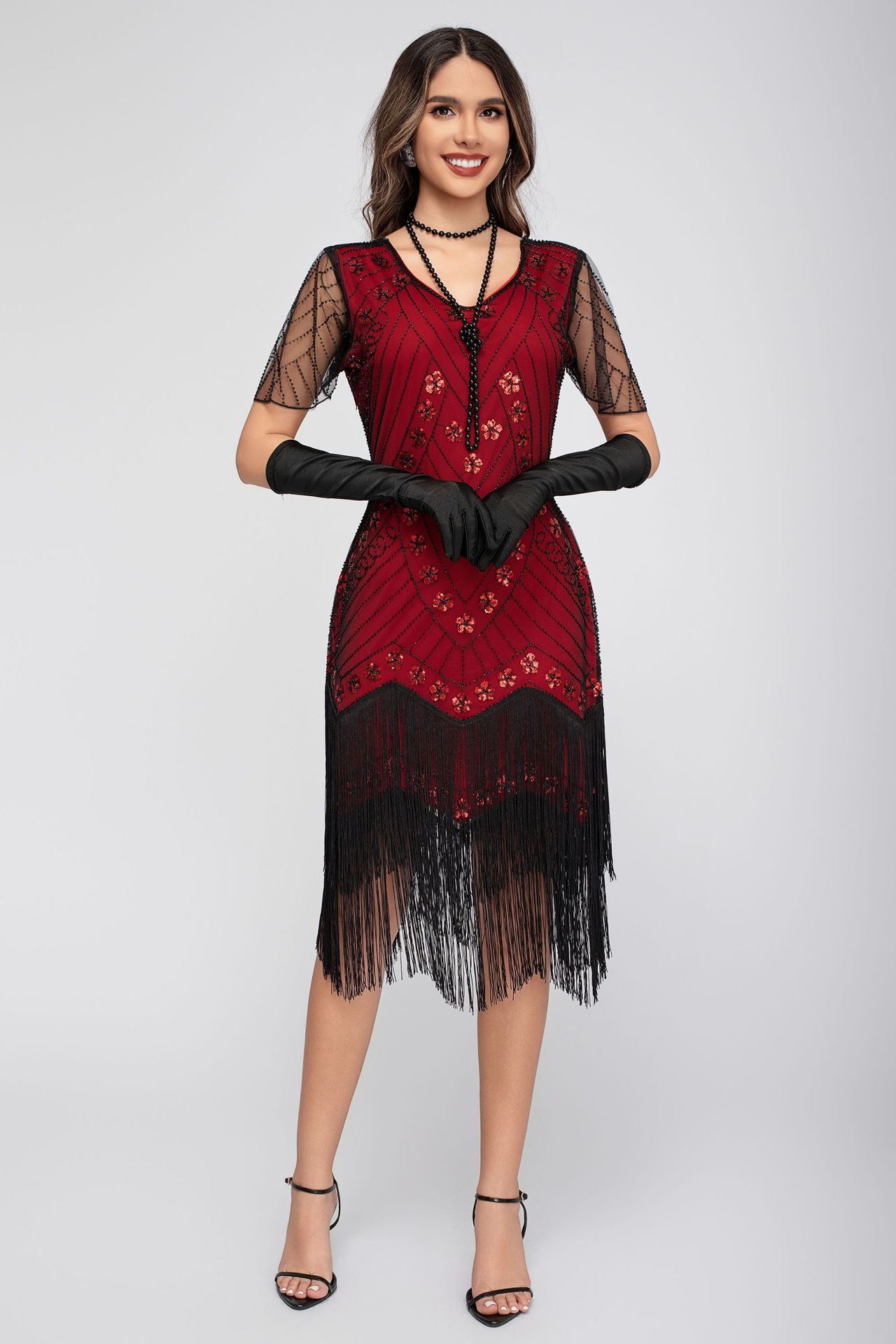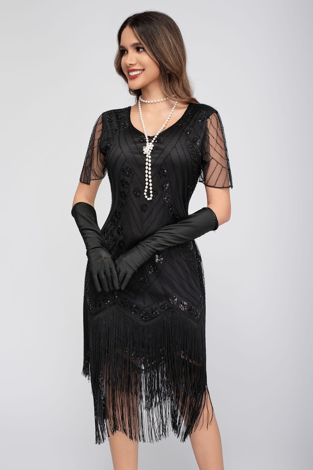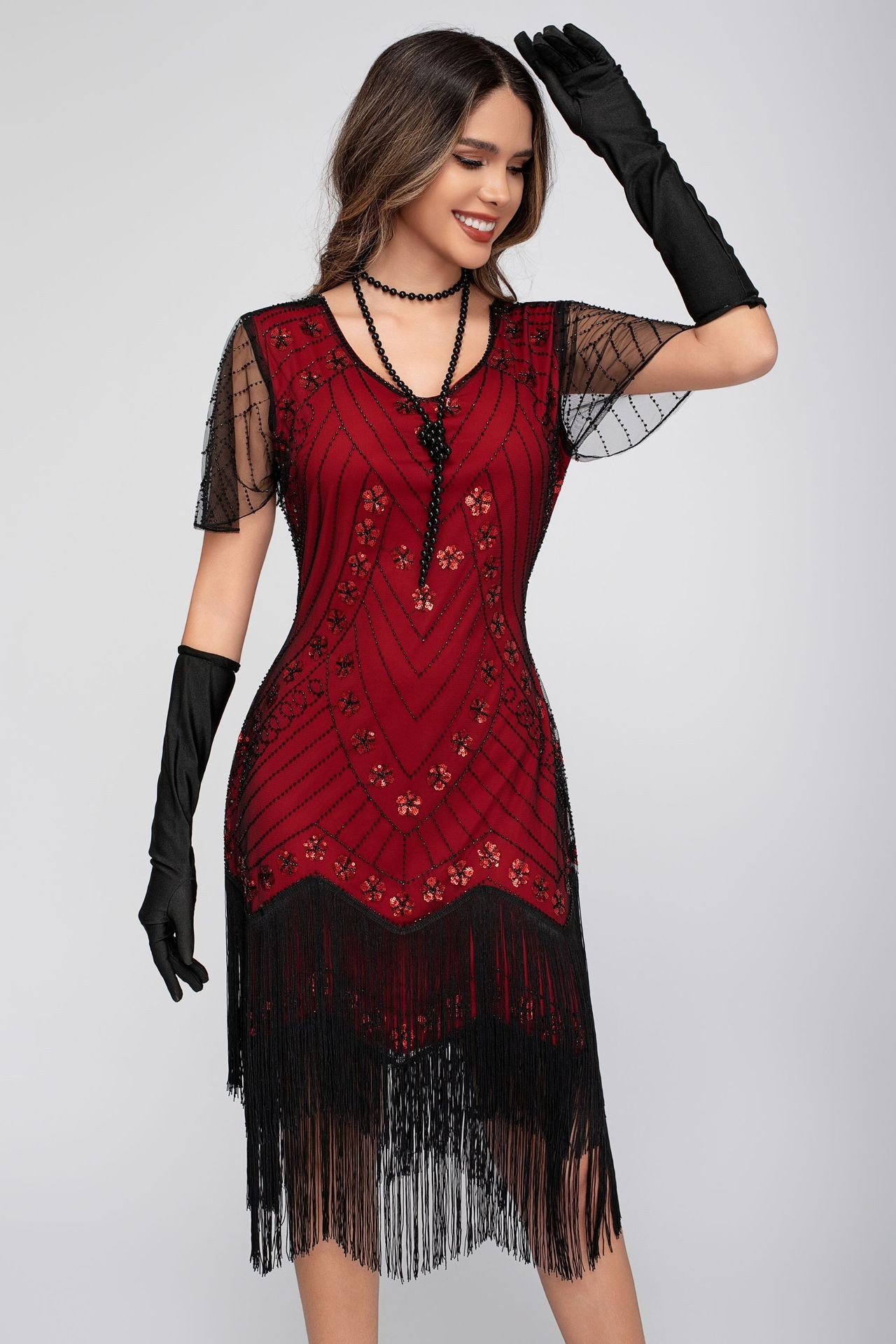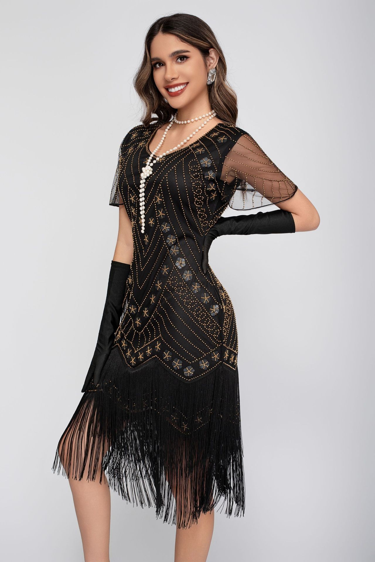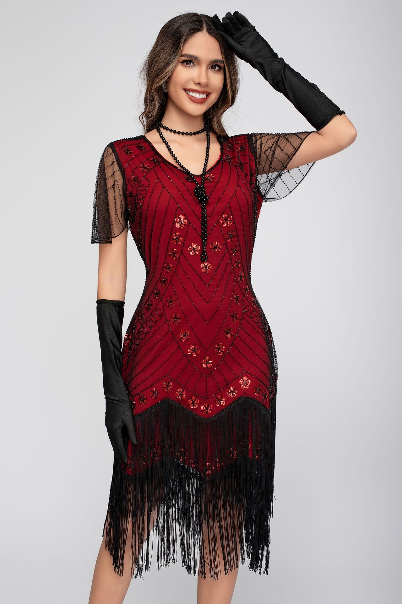 亮片流苏礼服裙1920欧美复古盖茨比舞会钉珠短袖连衣裙亚马逊跨境