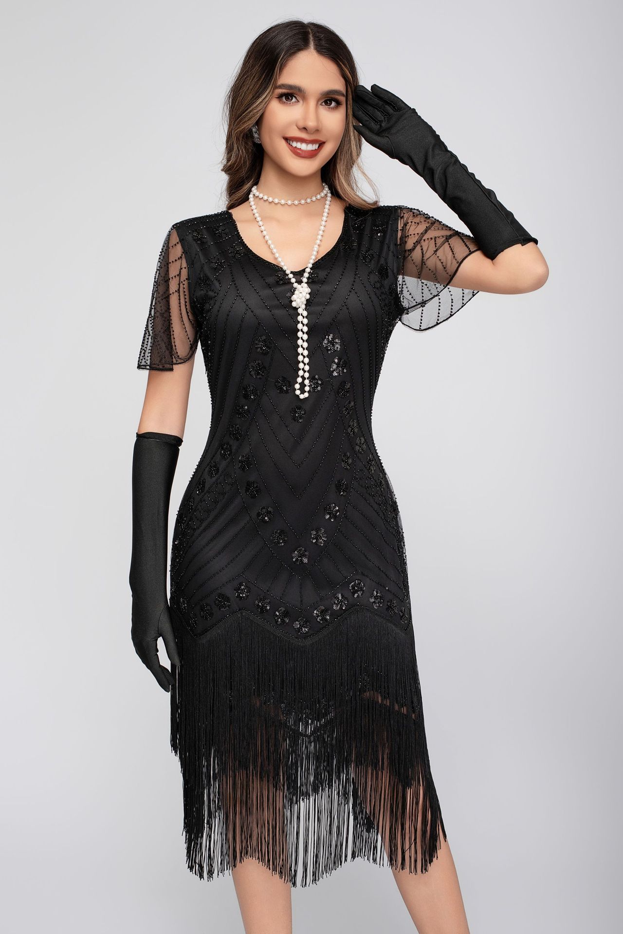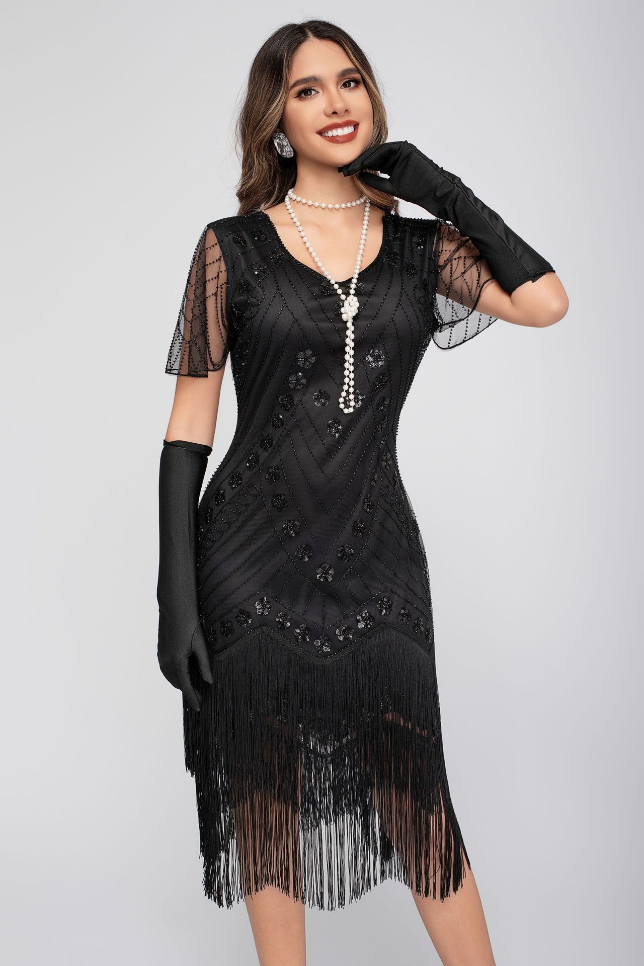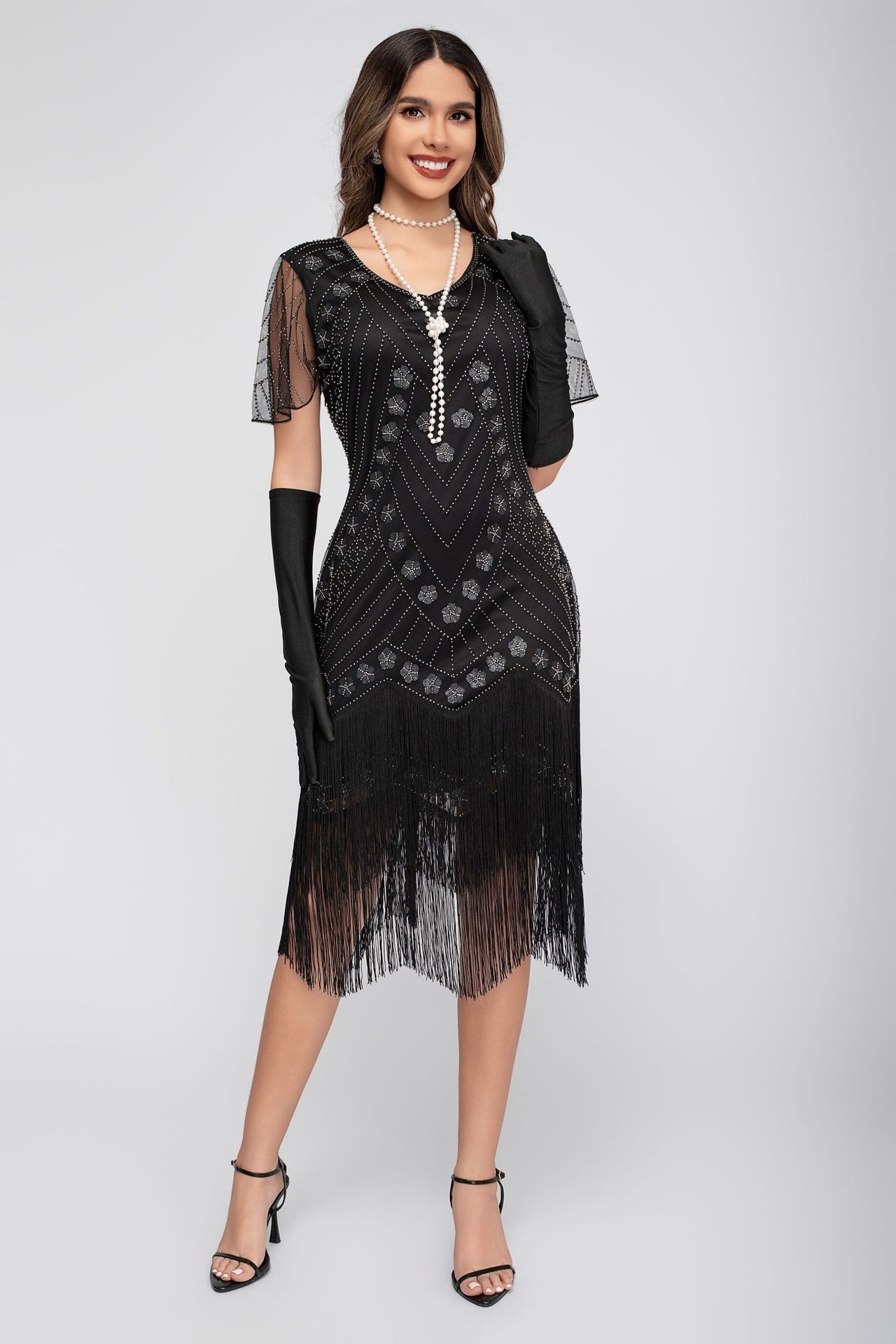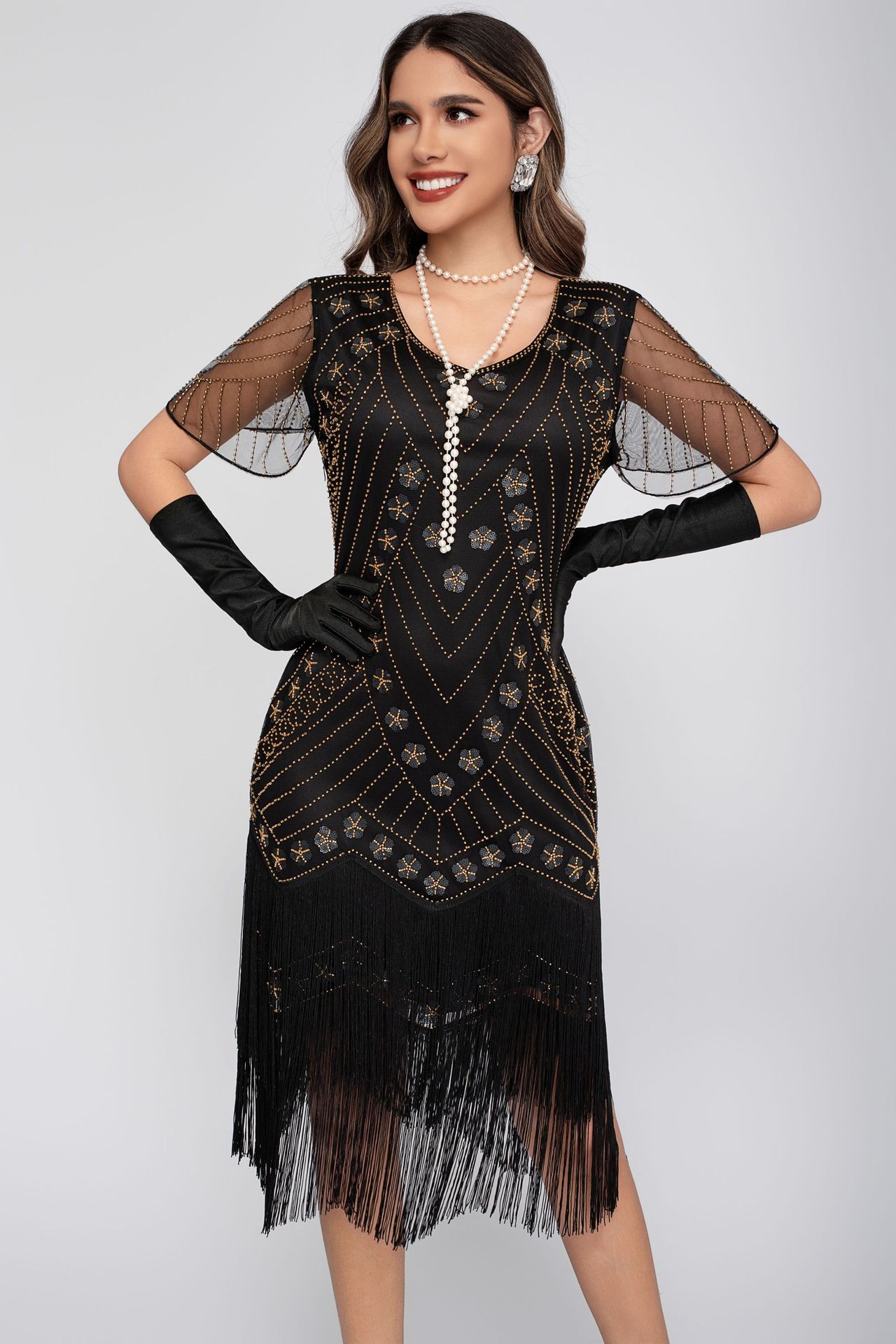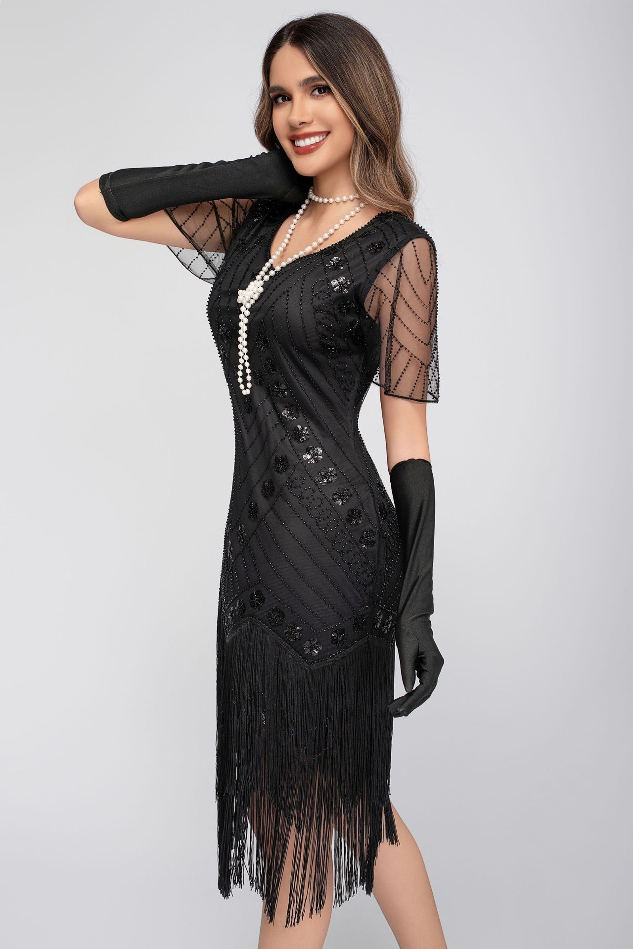 亮片流苏礼服裙1920欧美复古盖茨比舞会钉珠短袖连衣裙亚马逊跨境