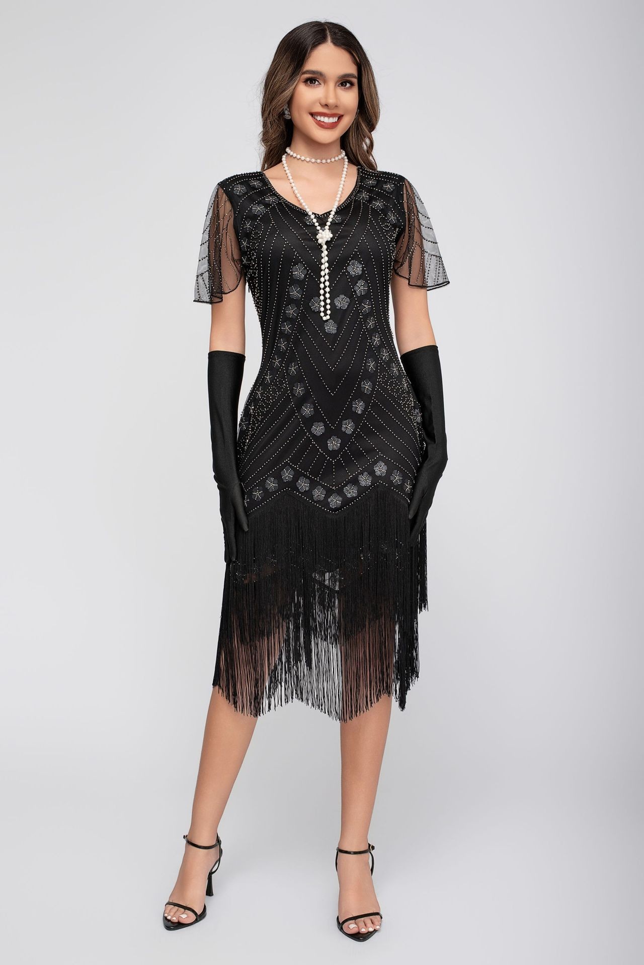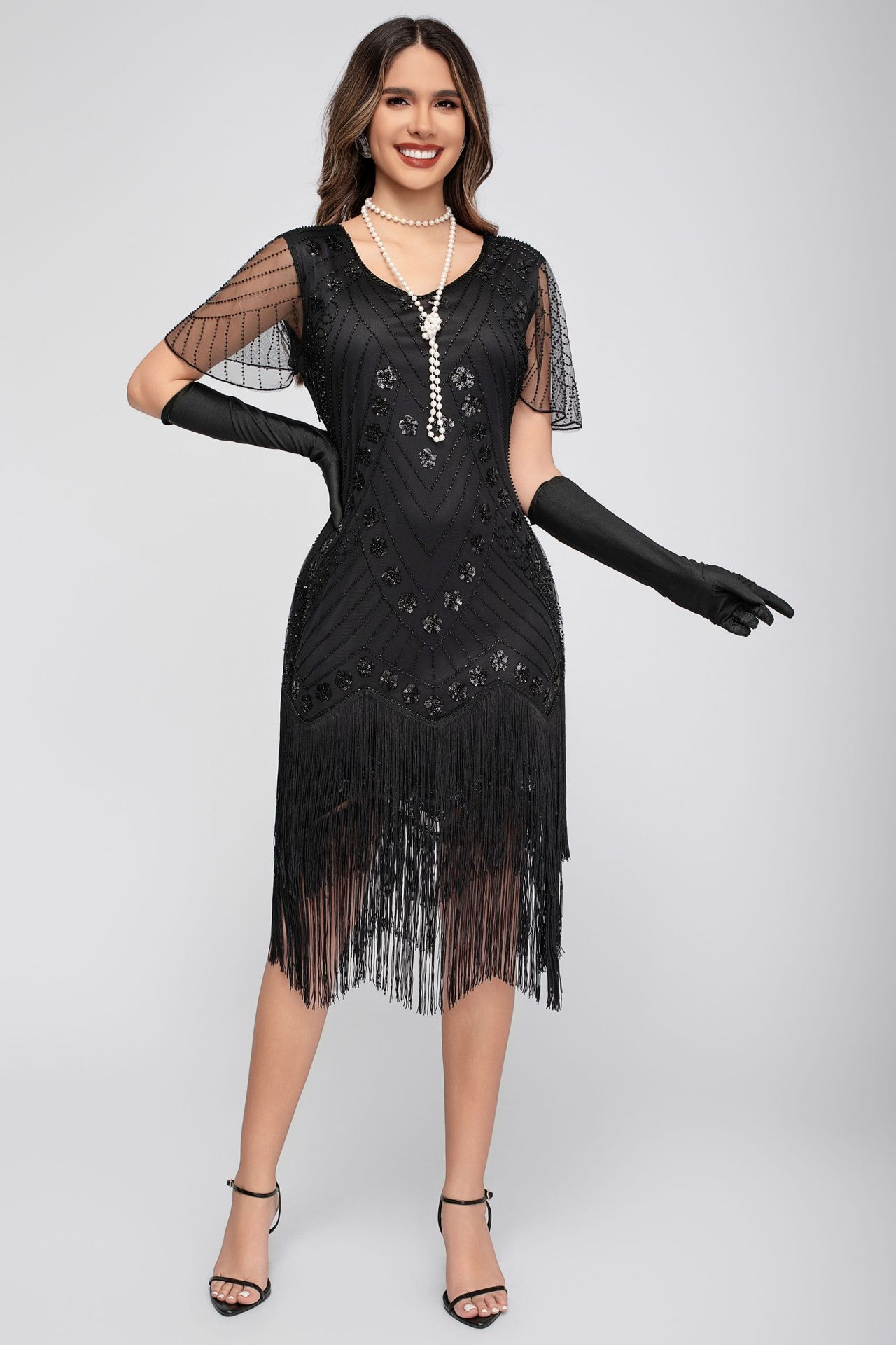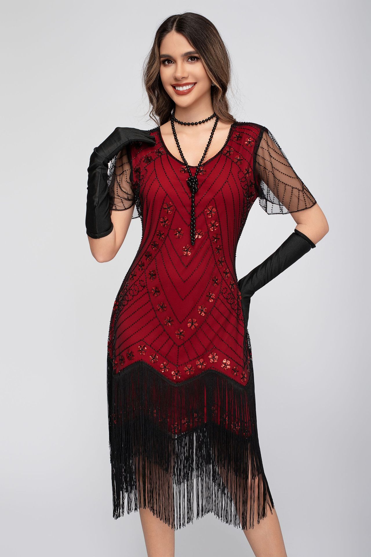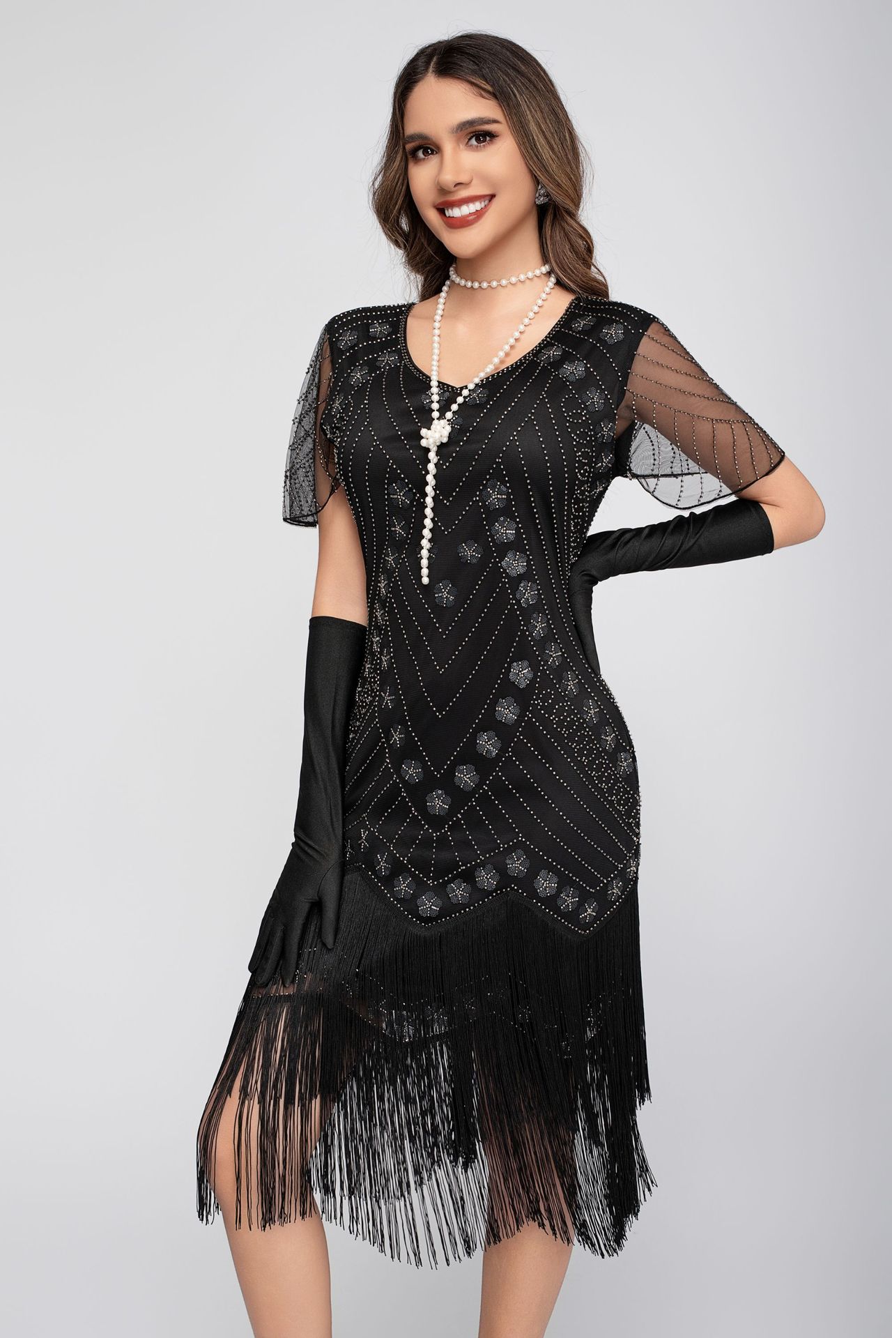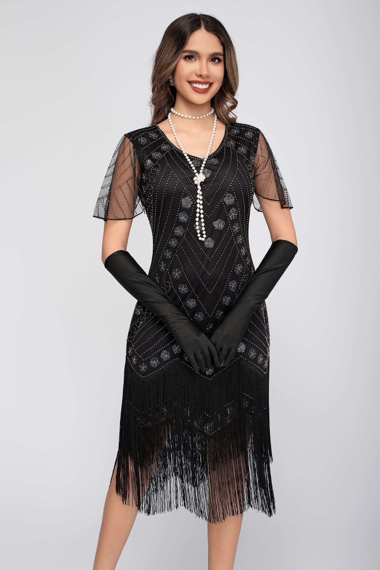 亮片流苏礼服裙1920欧美复古盖茨比舞会钉珠短袖连衣裙亚马逊跨境