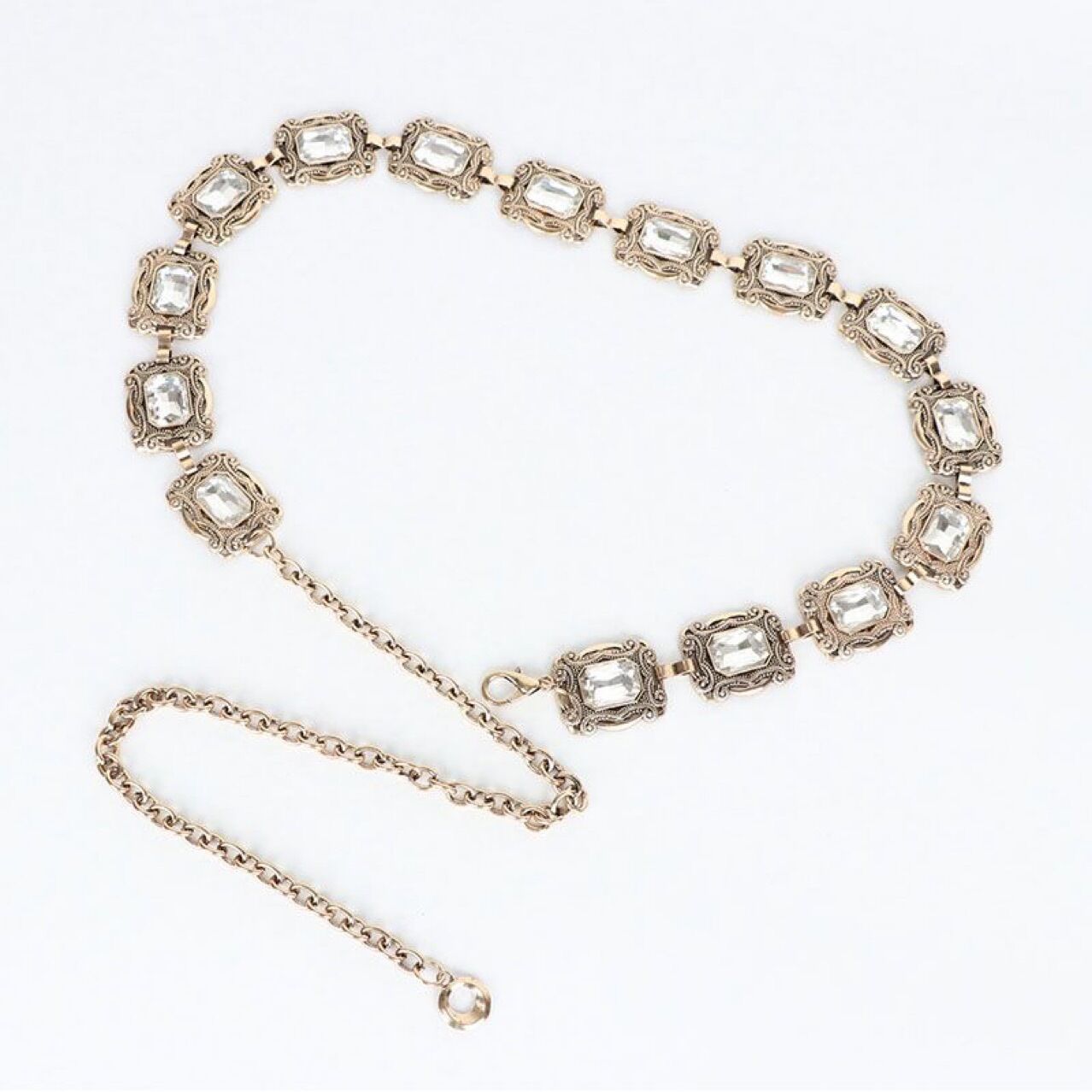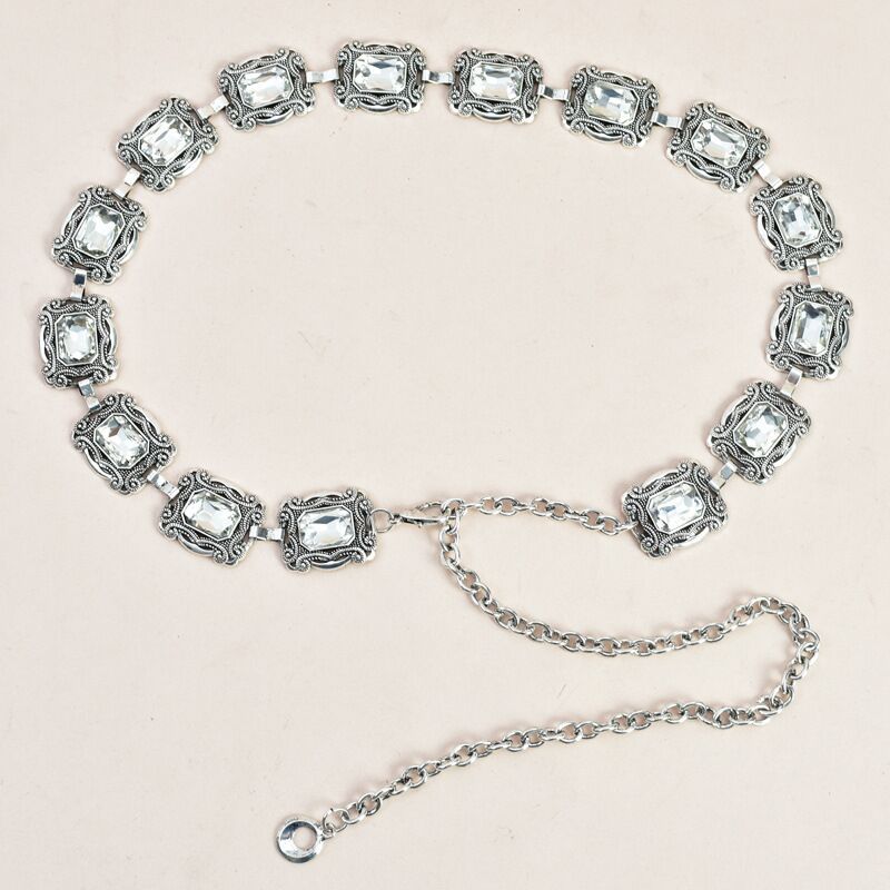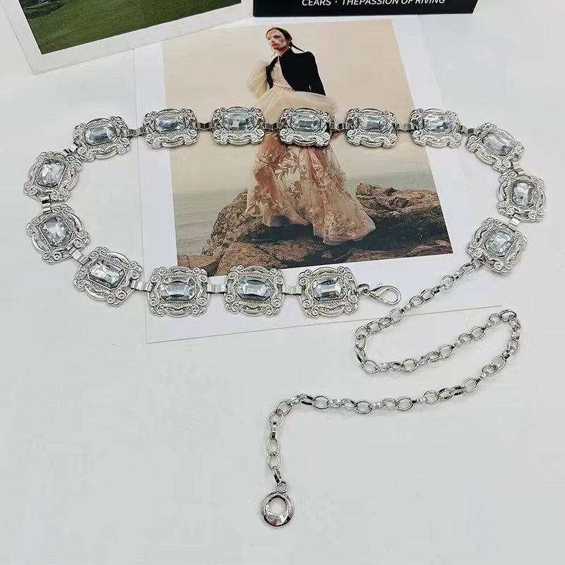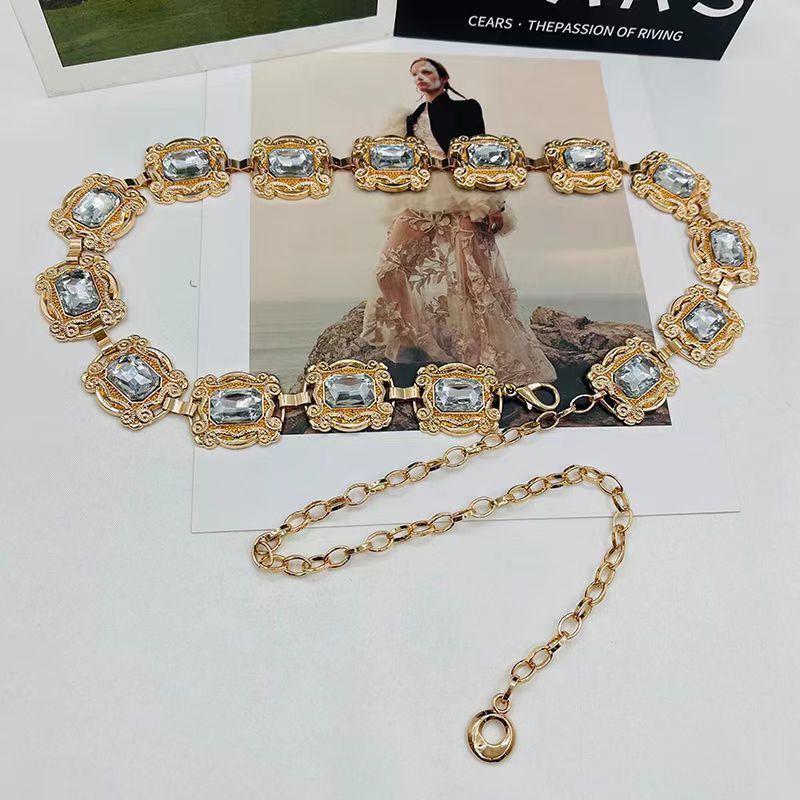 女士腰带休闲复古雕花装饰亚克力水晶金属链条腰链现货
