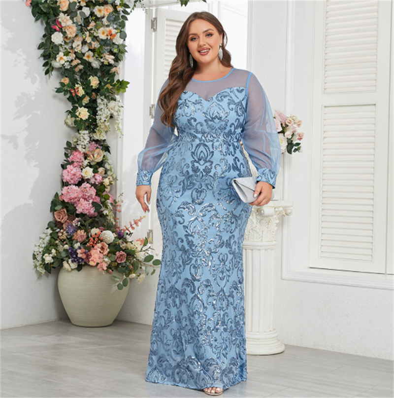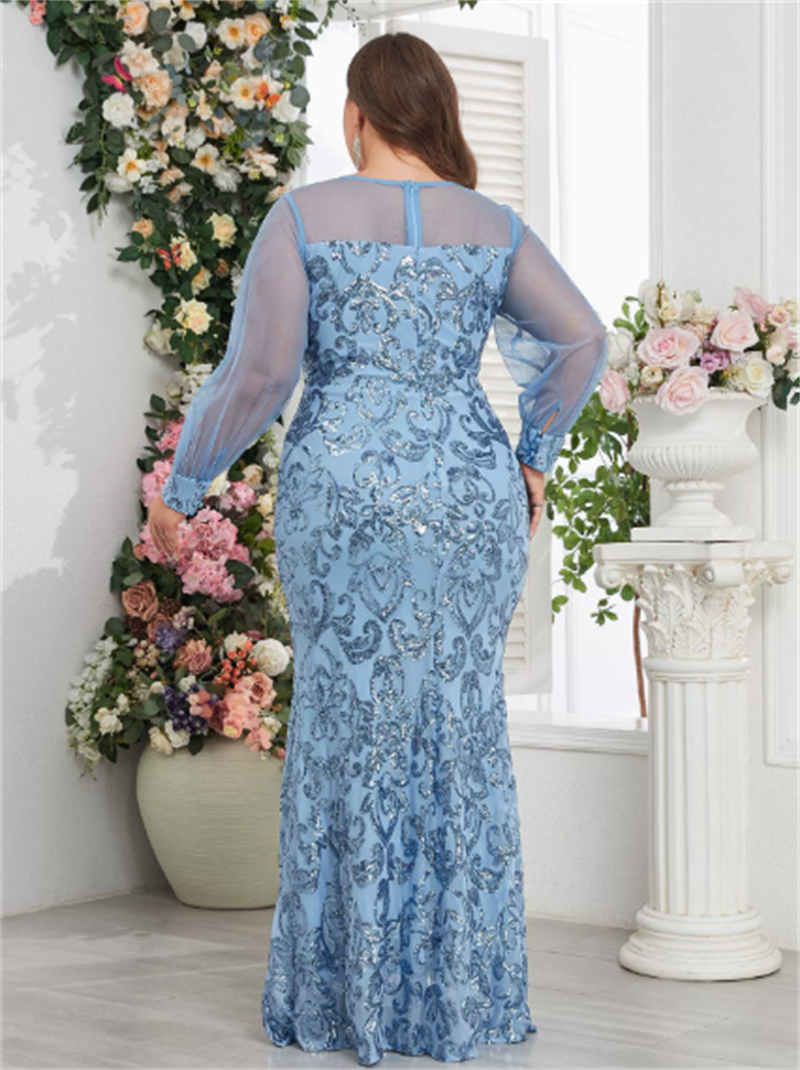 新款女式透视袖圆领奢华天蓝色美人鱼闪亮亮长款大码派对晚礼服