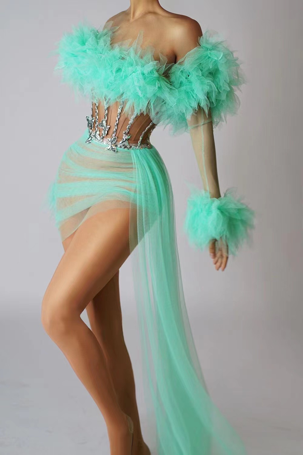 新款网纱蕾丝边性感包臀连衣裙水钻流苏夜店蓬蓬裙晚会表演迷你裙