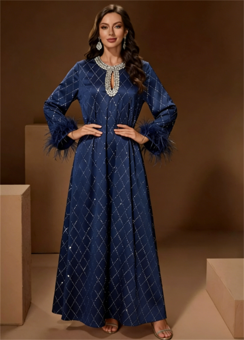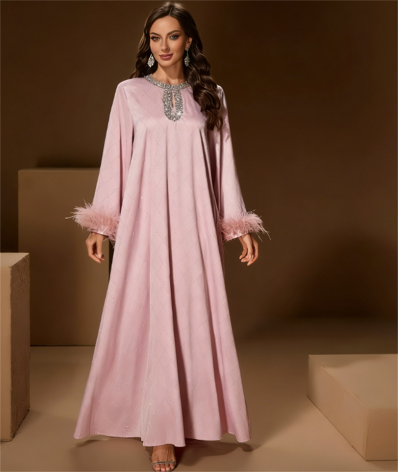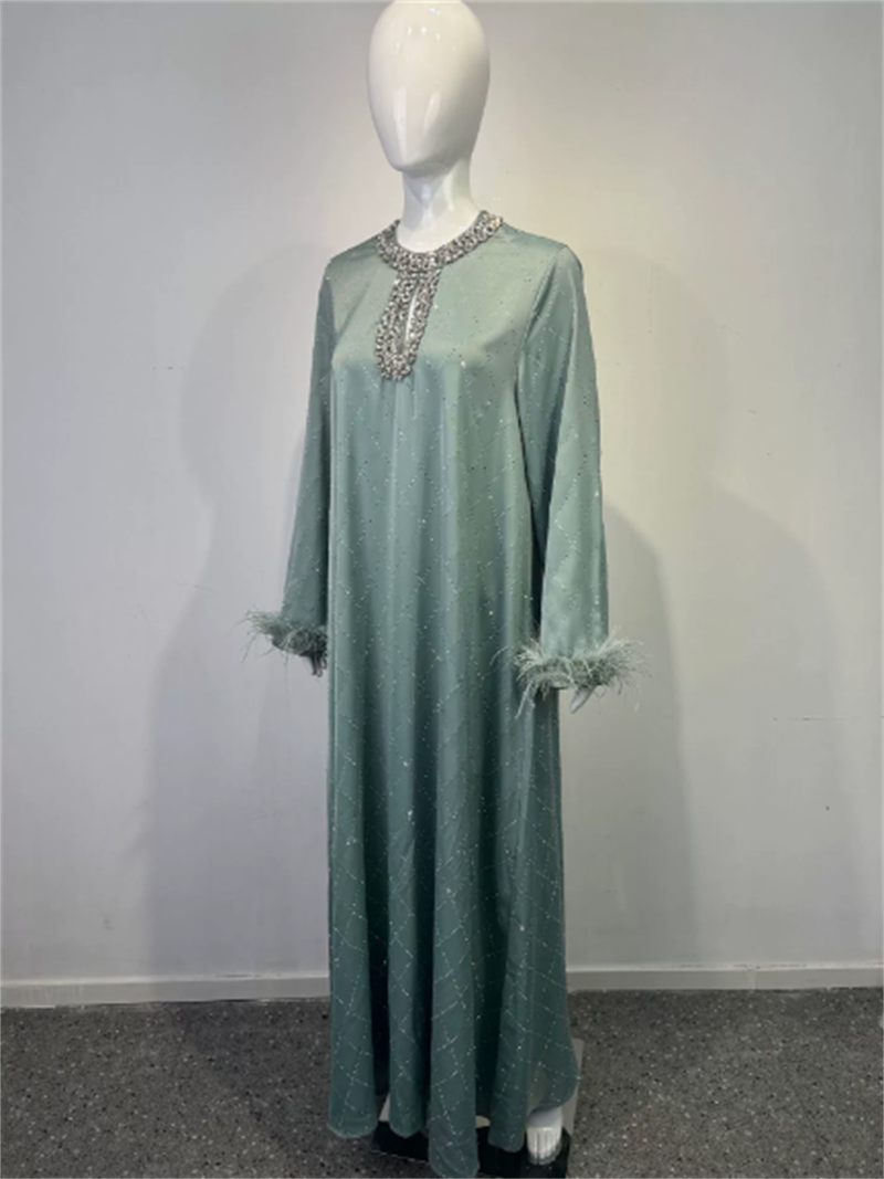 • 新款跨境穆斯林中东 高档时尚圆领手工钉珠灯笼袖连衣裙 长袍