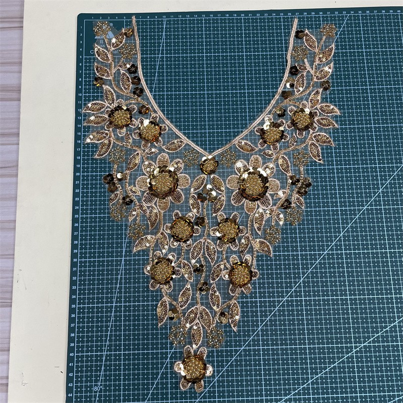 • 时尚新款网纱底珠管亮片珠子手缝金色布贴蕾丝花边服装辅料
