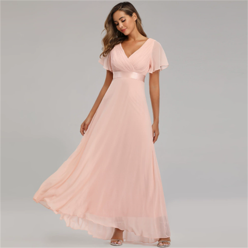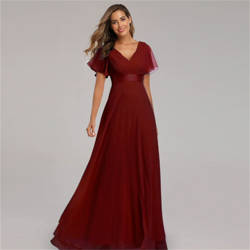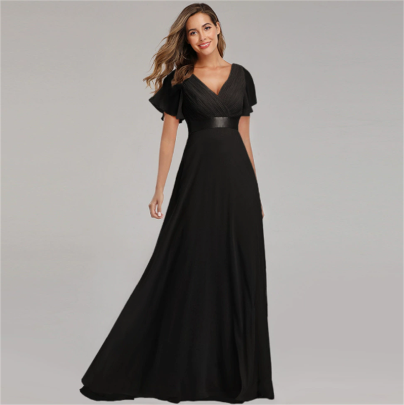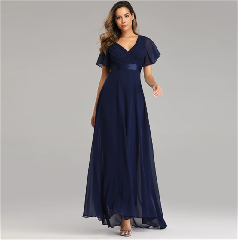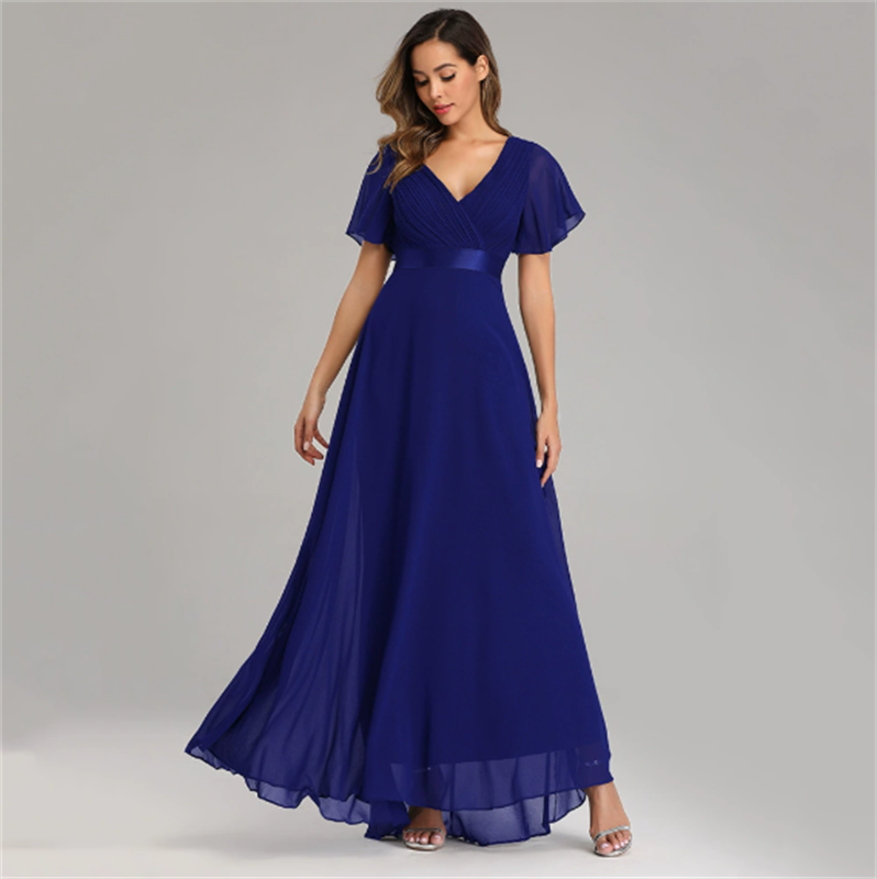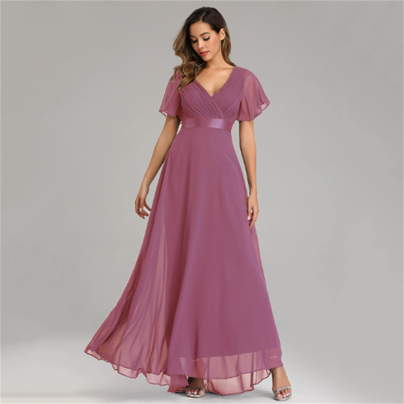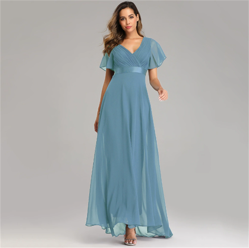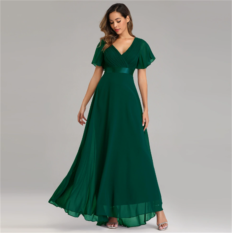 • 春夏手工折大摆双V领喇叭袖连衣裙弹性雪纺宴会伴娘大码晚礼服