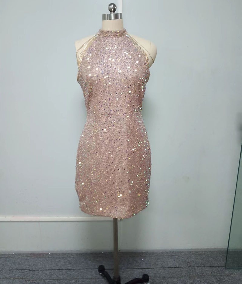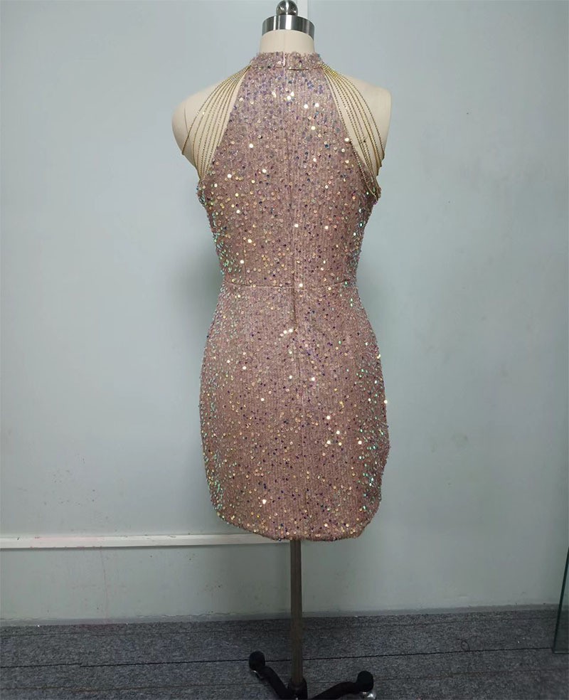 • 春夏新品时尚挂脖性感水晶链条包臀亮片欧美连衣裙中腰晚礼服