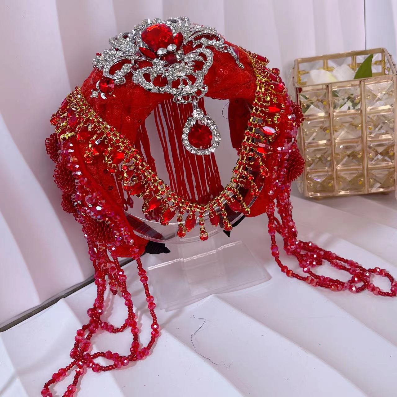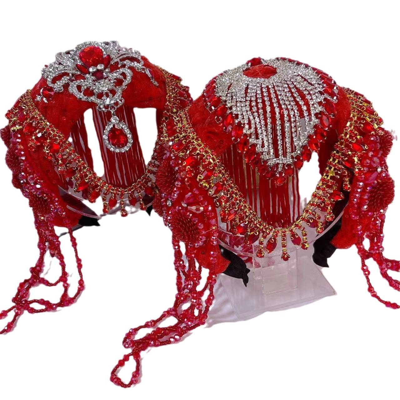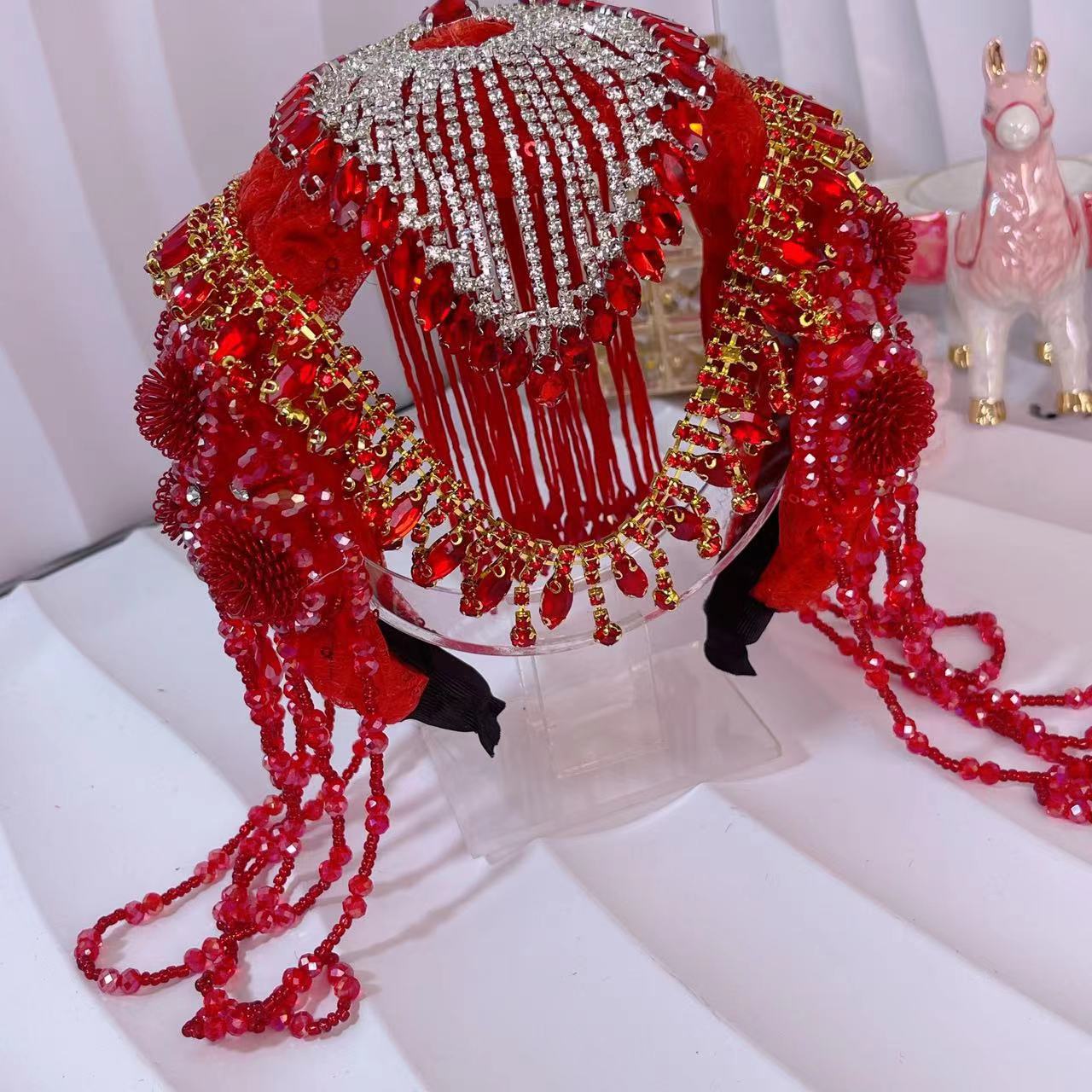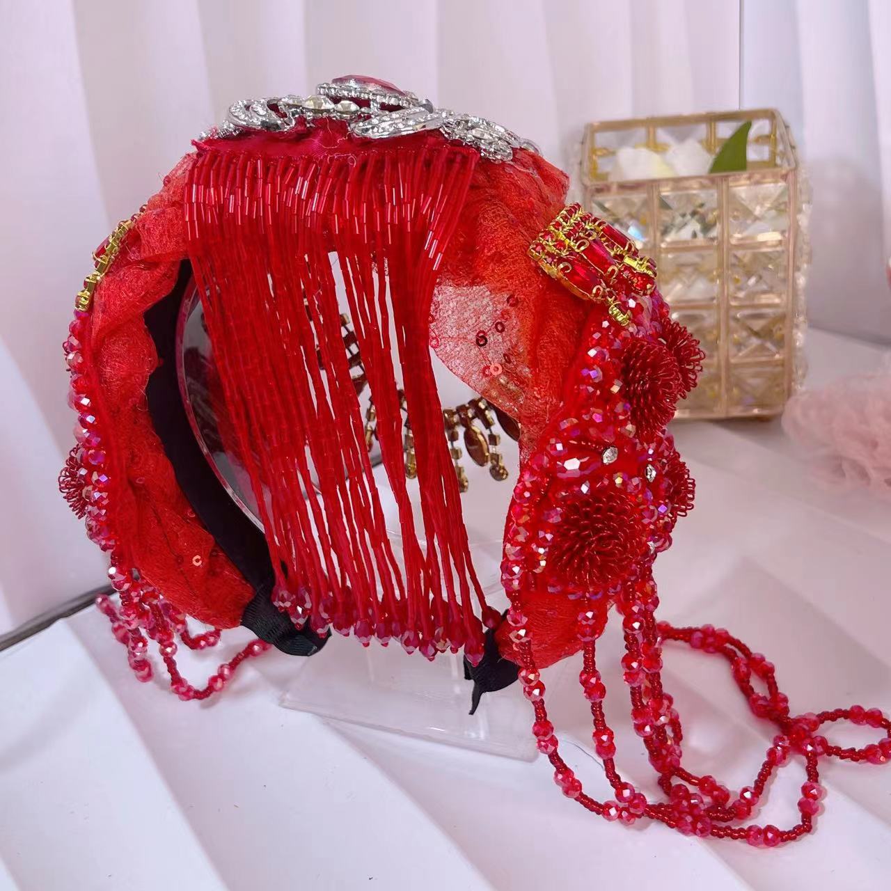 热门夸张爆款扭秧歌红色吊坠爱心双面长流苏发箍
