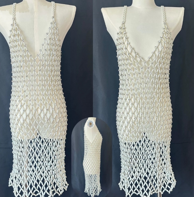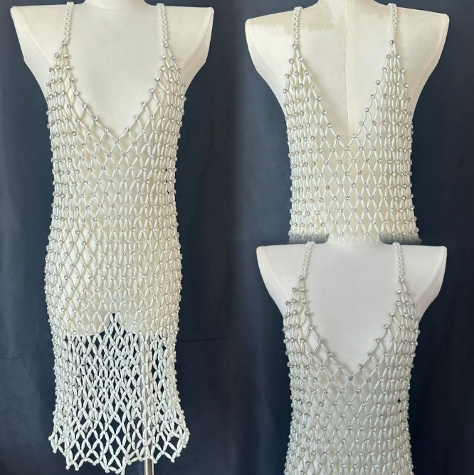 现货爆款镶钻菱形格子复古珍珠纯手工串珠镂空吊带连衣裙气质修身