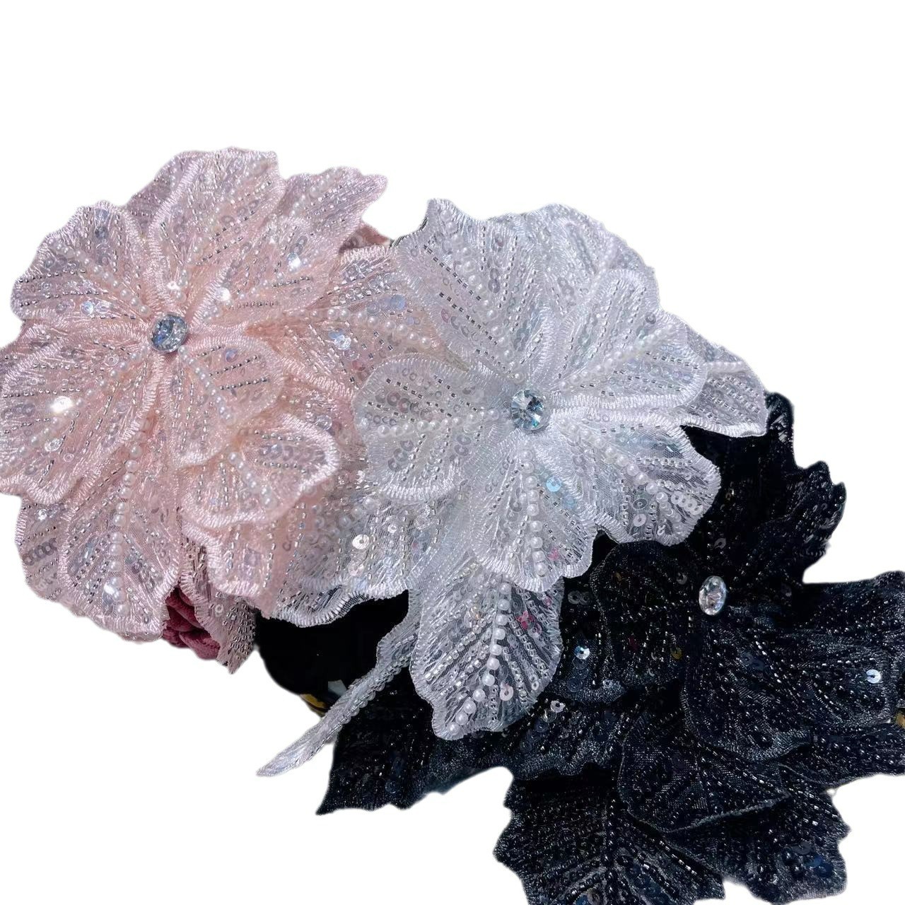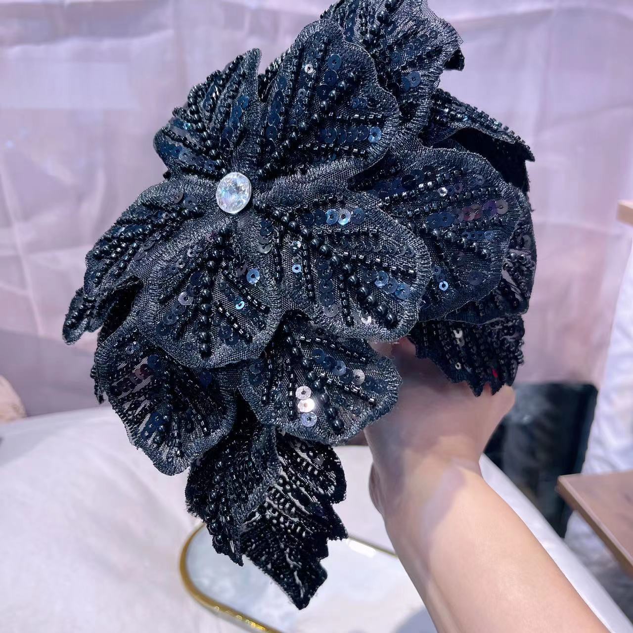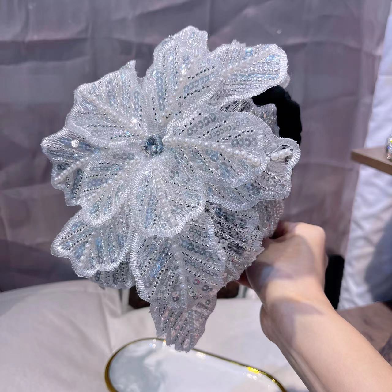 超大个网纱多层亮片钉珠立体花朵遮白发个性洋气走秀发箍
