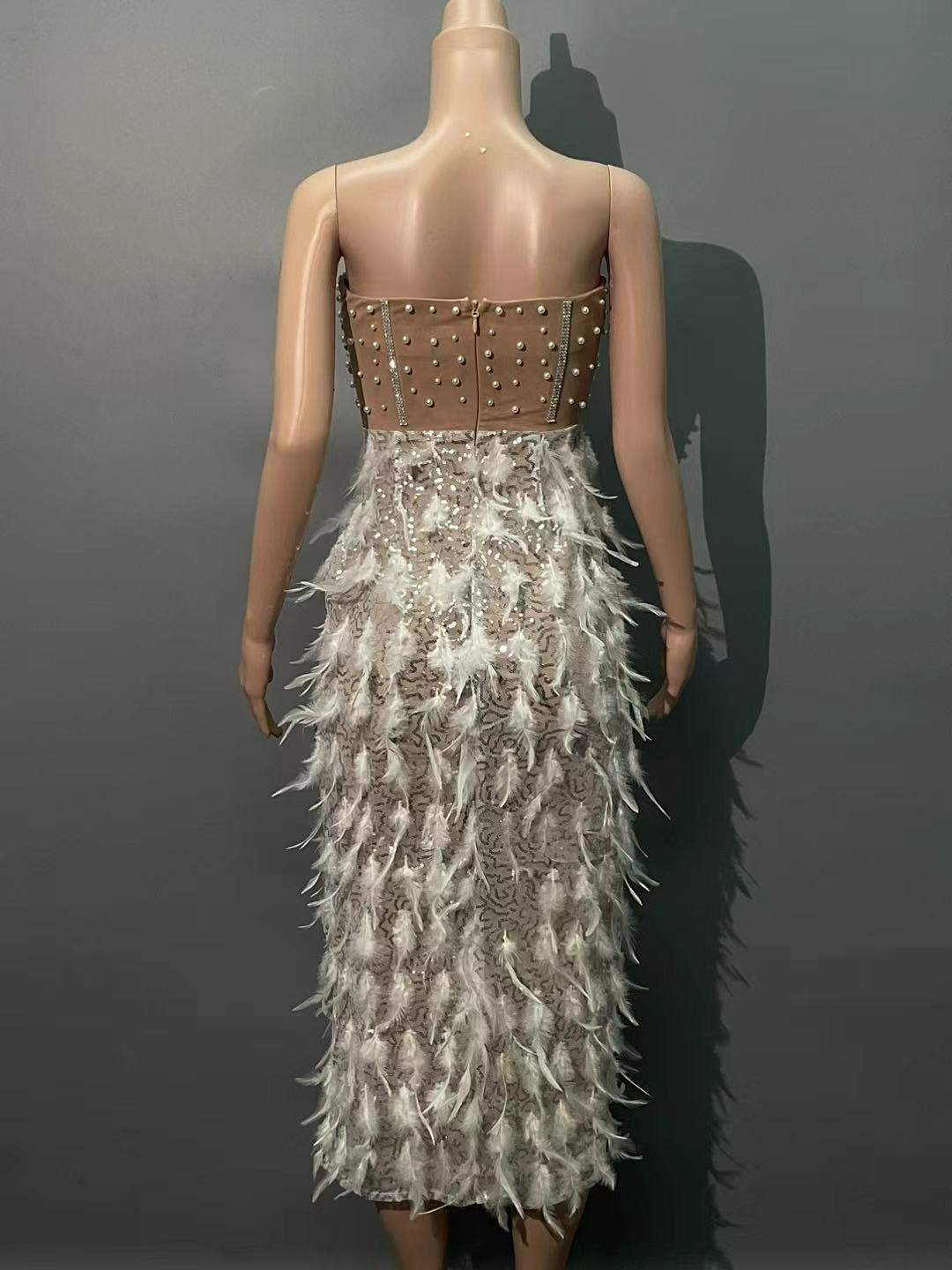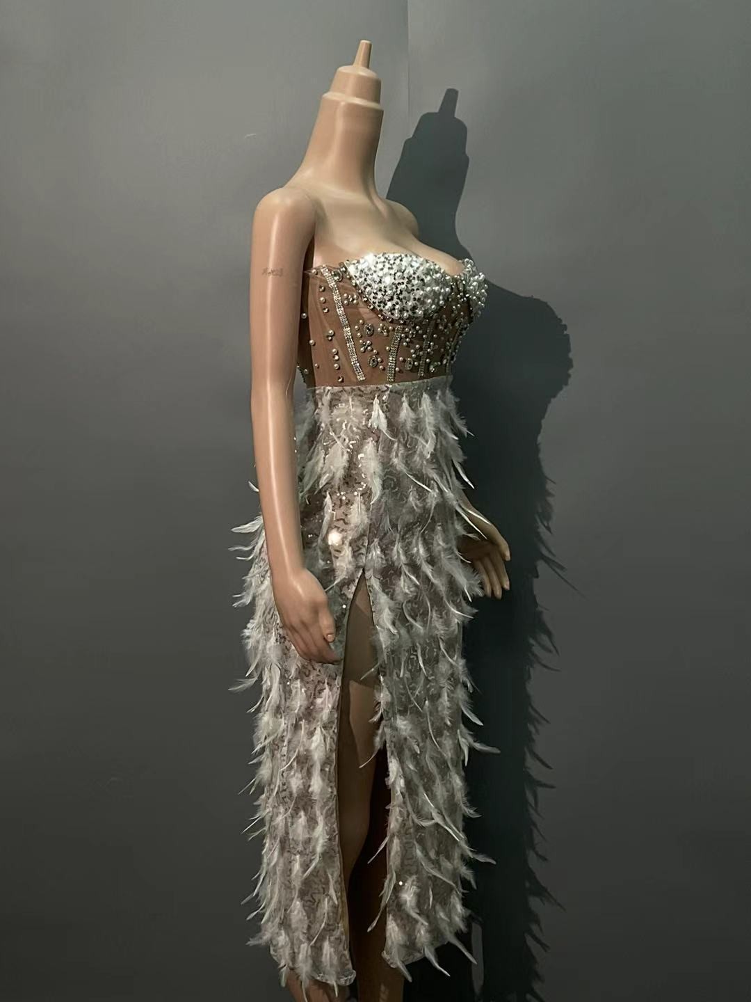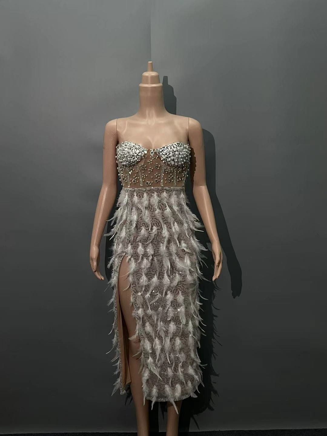 跨境爆款奢华羽毛钉珠高开叉抹胸连衣裙 华丽生日派对宴会晚礼服