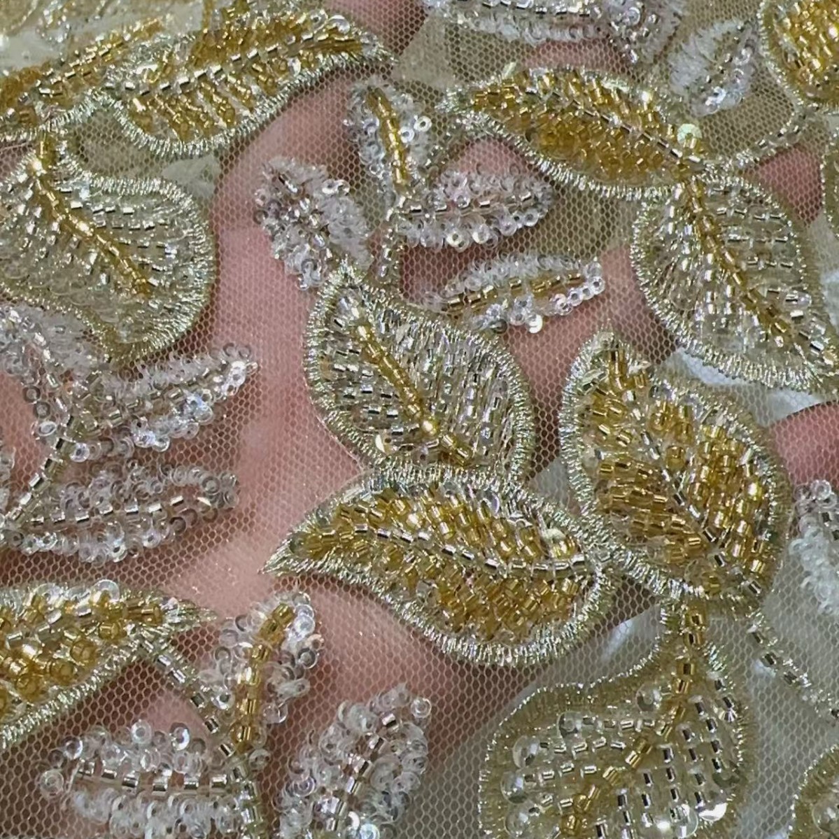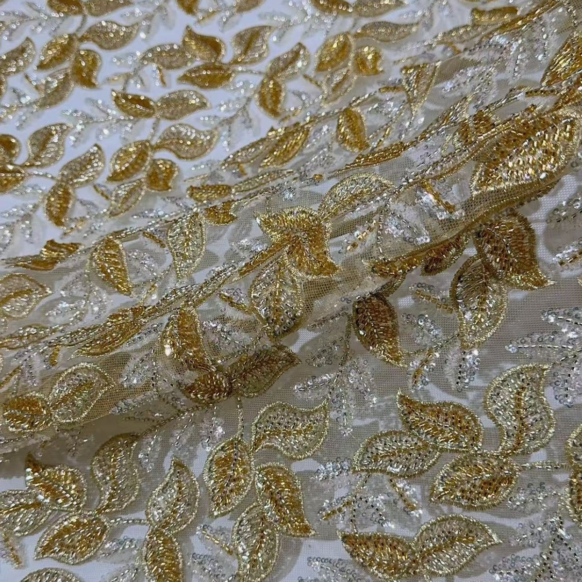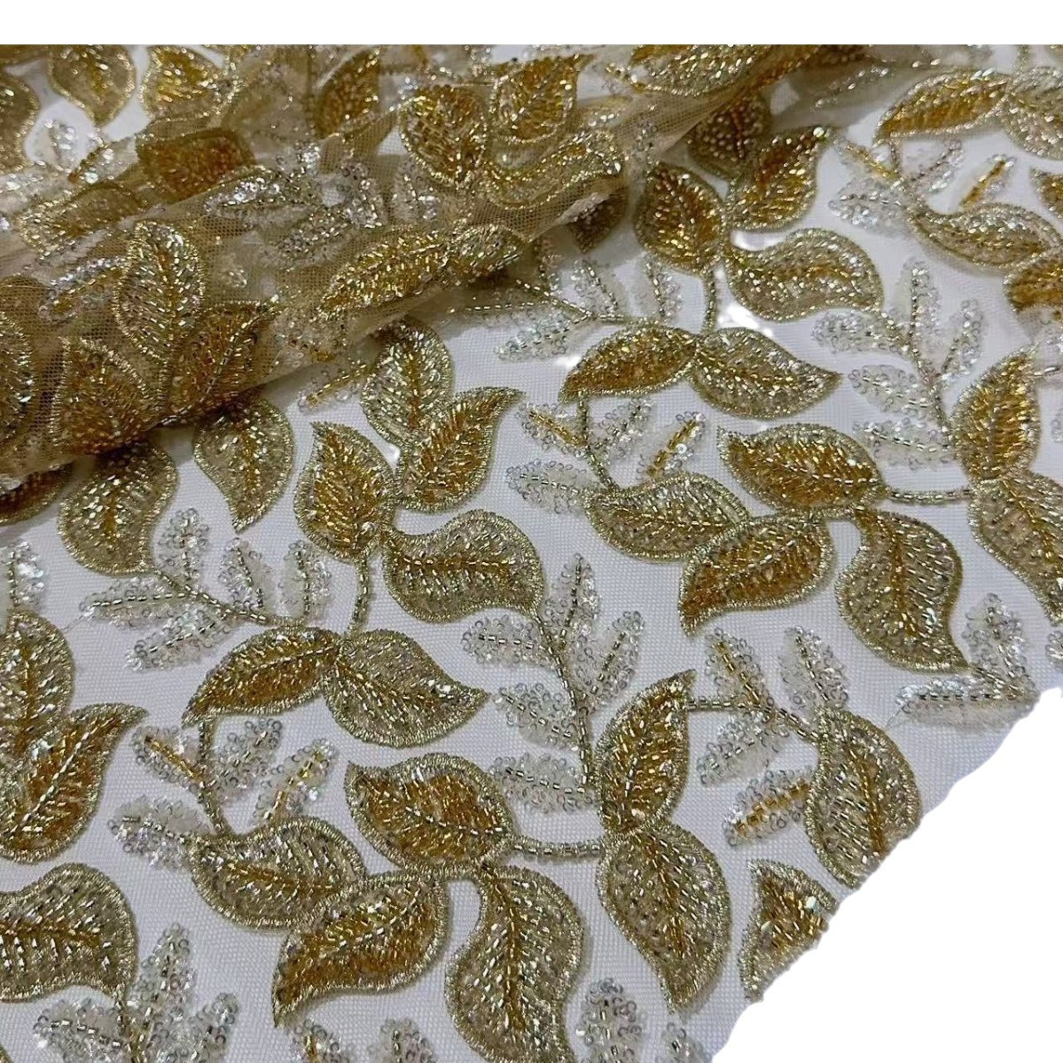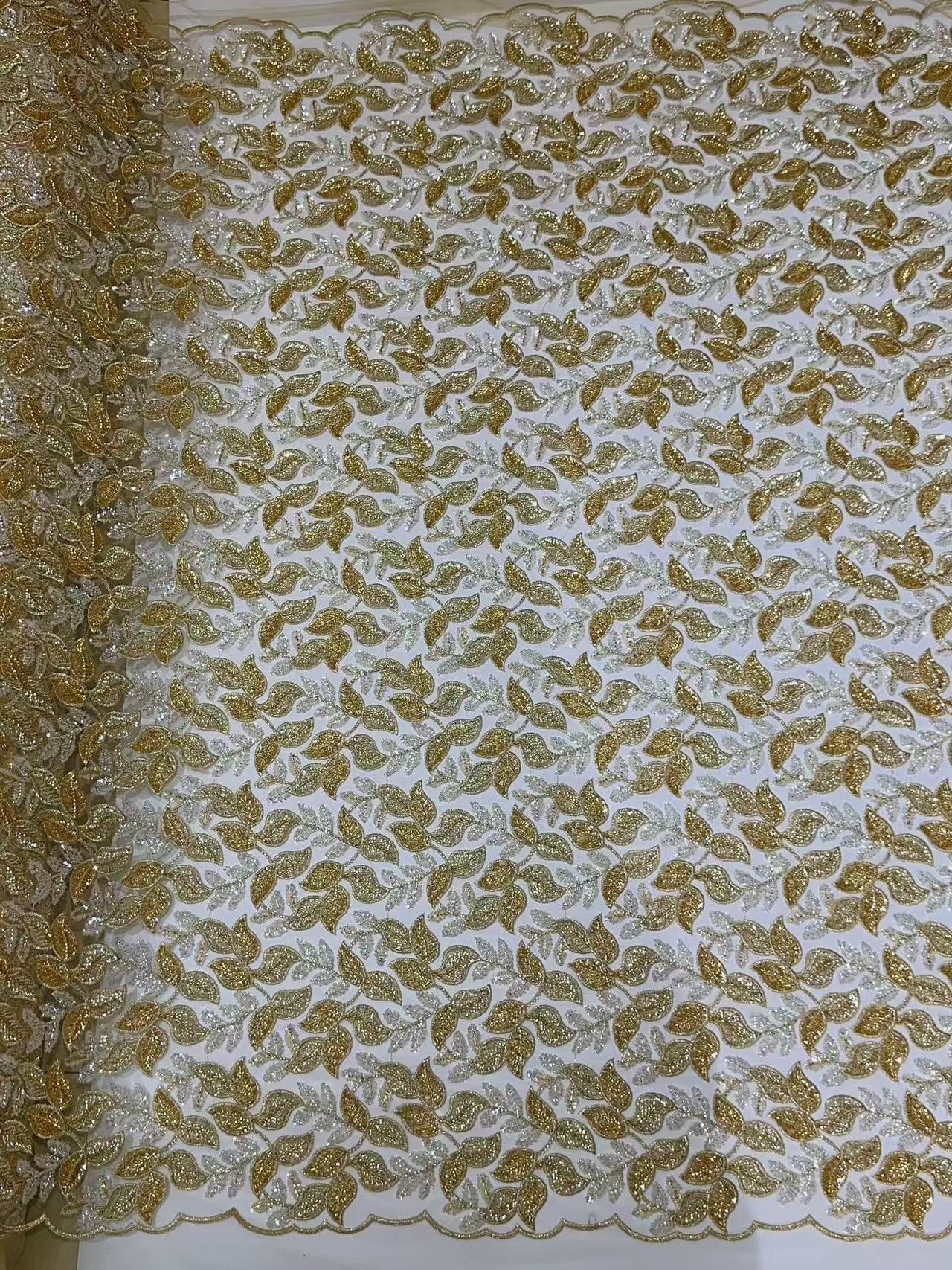 跨境金线重工串珠亮片叶子刺绣布礼服裙婚纱面料