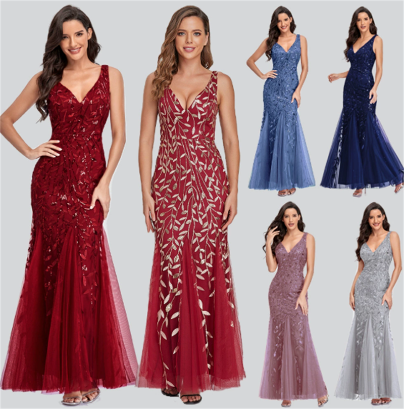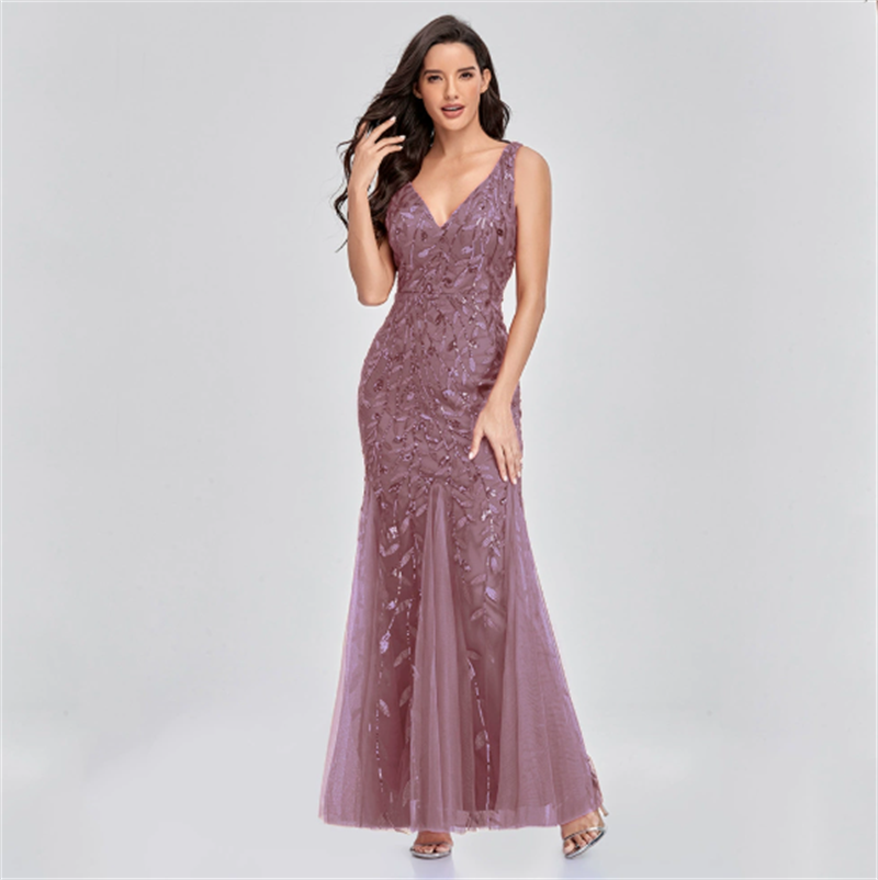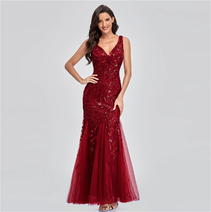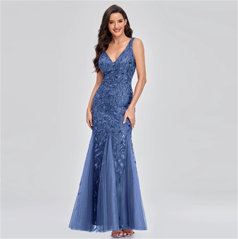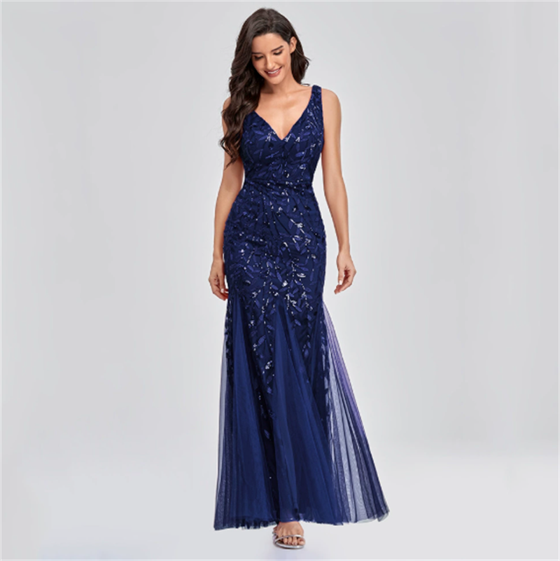 连衣裙性感长裙无袖V领绣花珠片修身鱼尾伴娘晚礼服女