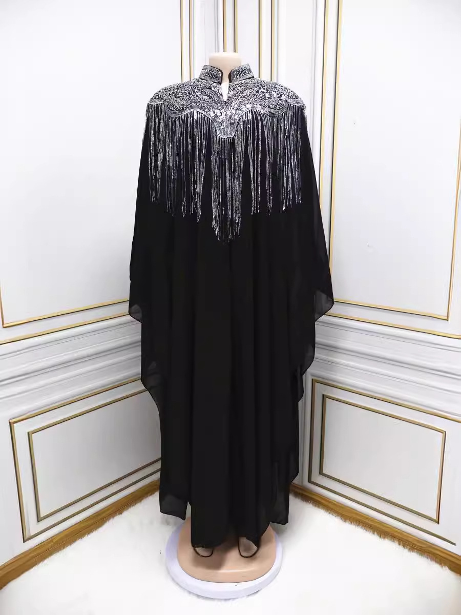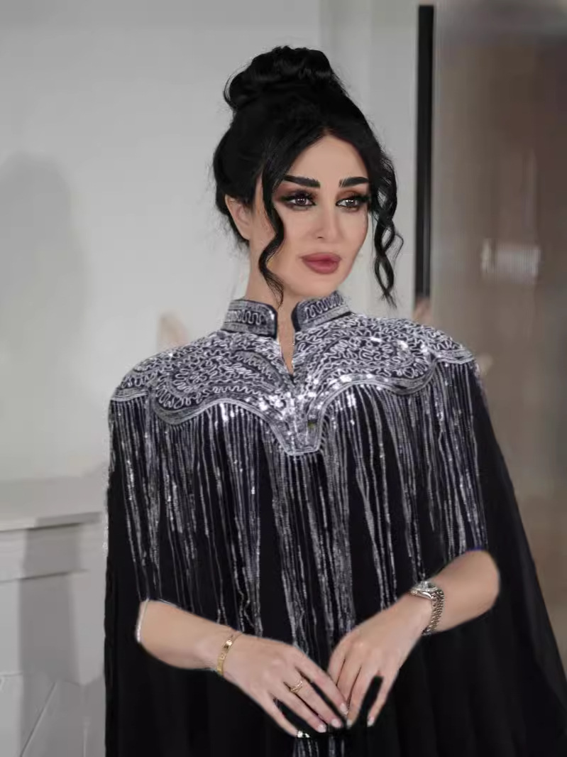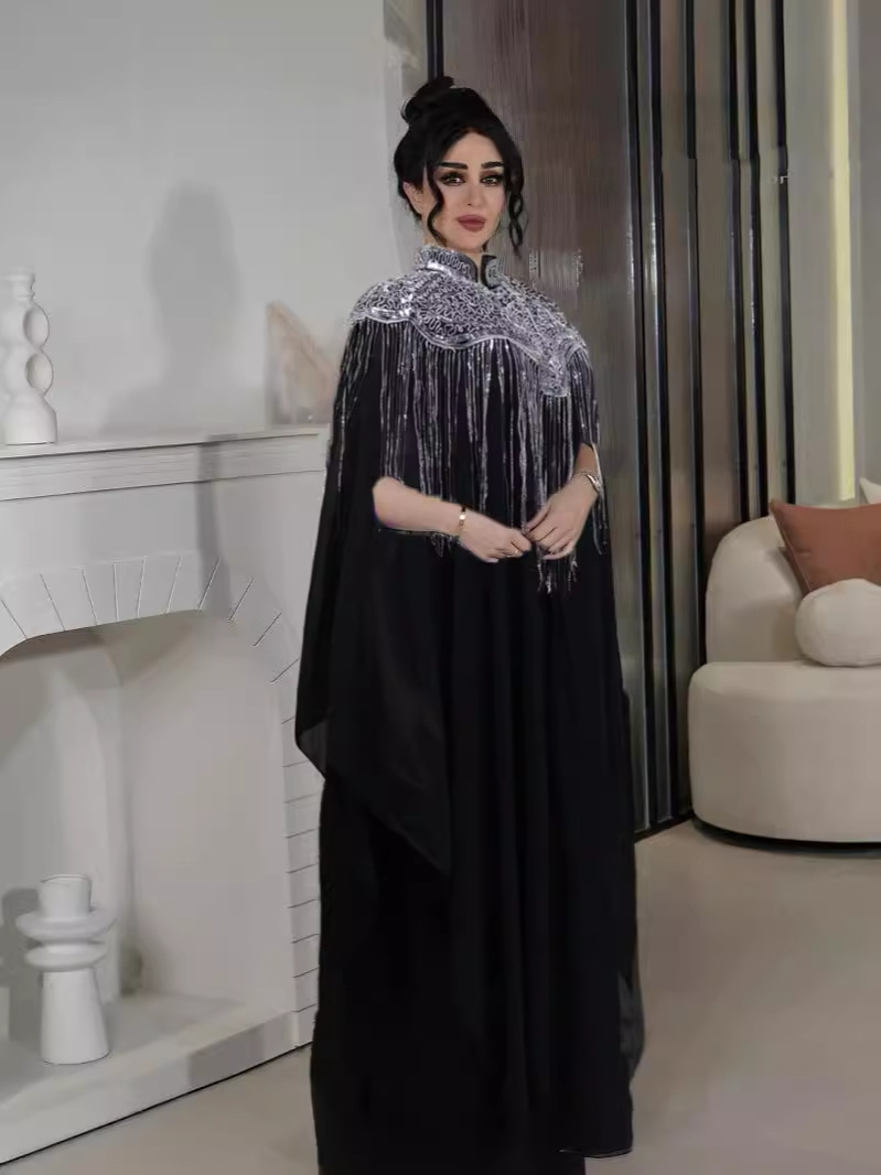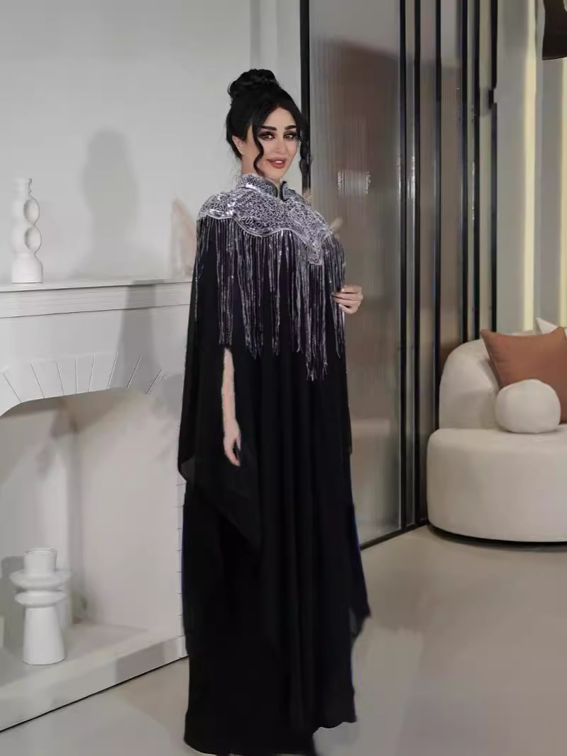 2024沙特中东穆斯林珠片流苏重工两件套套装连衣裙长袍民族服饰女
