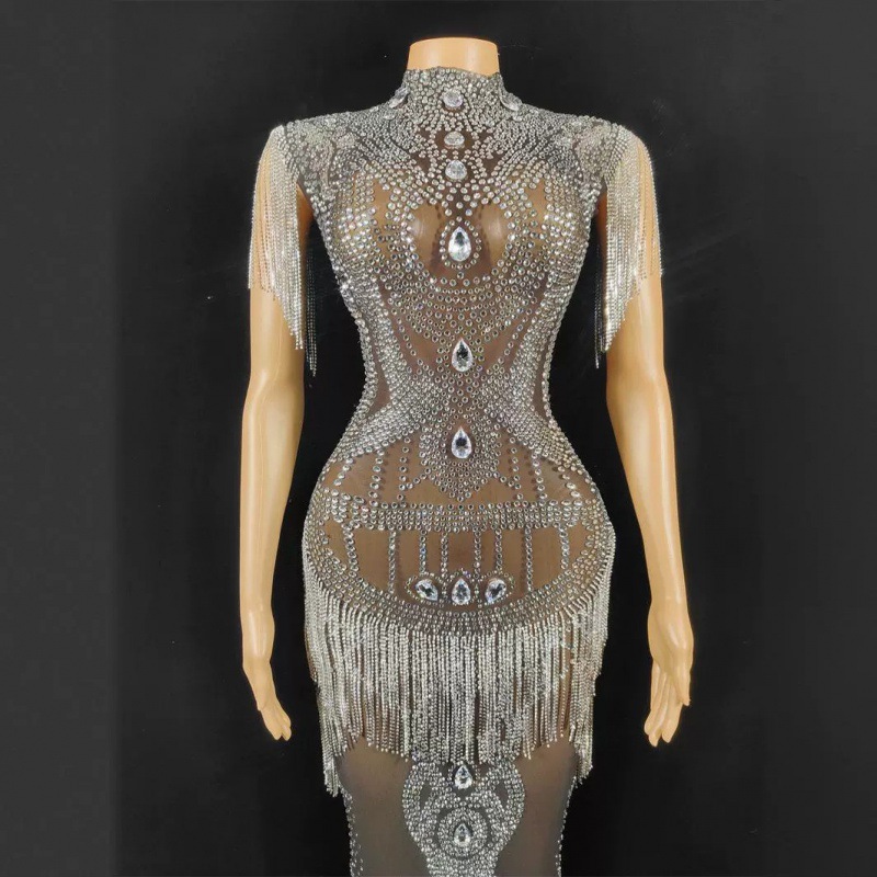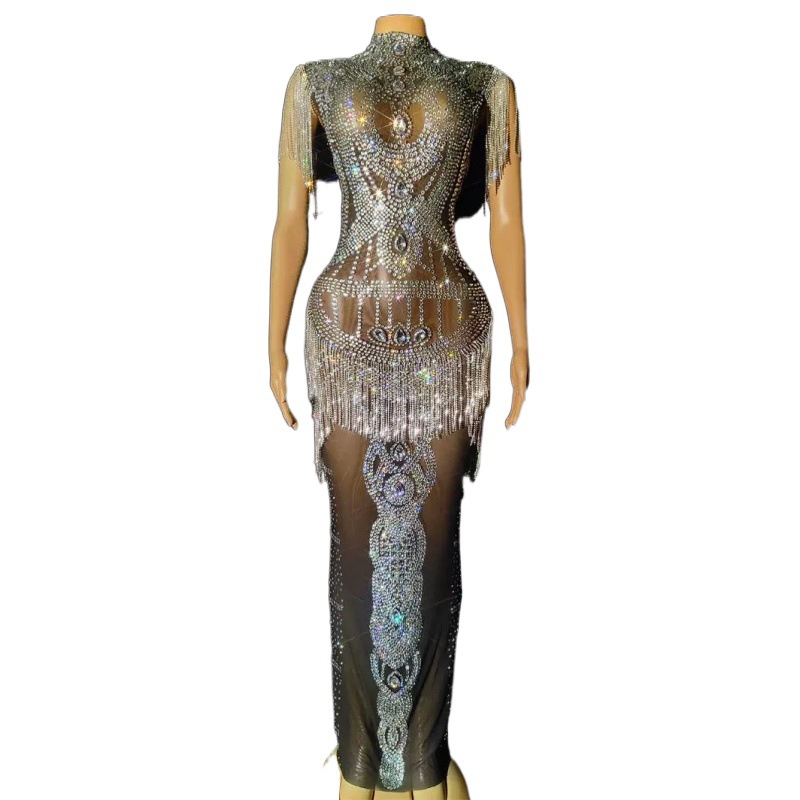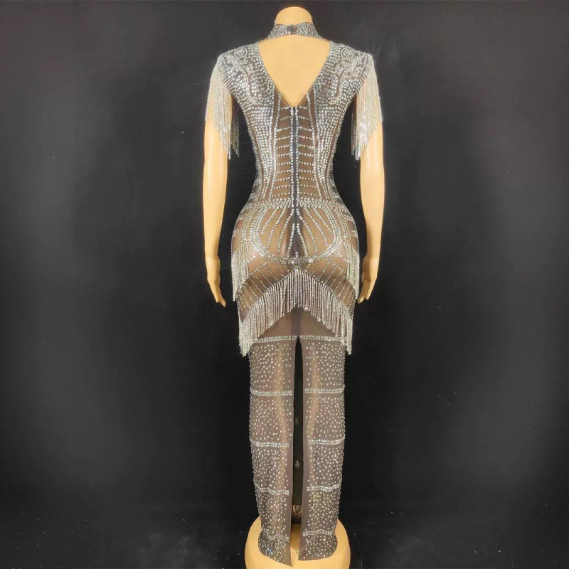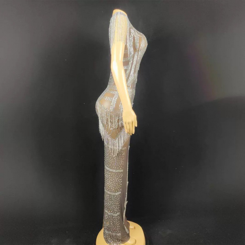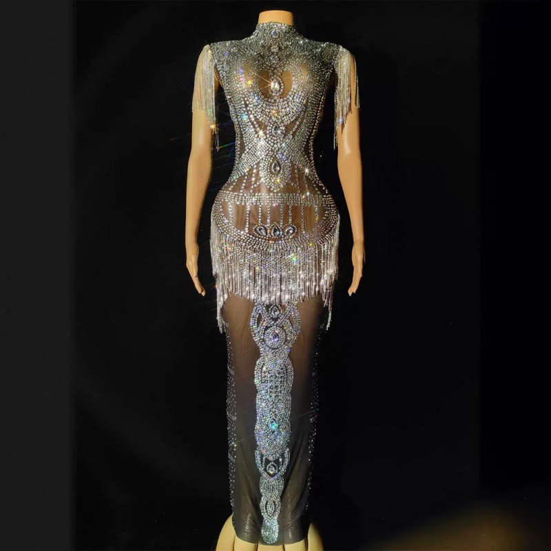 GC节日庆祝晚礼服派对聚会水钻流苏性感弹力透视包臀长裙舞台演出