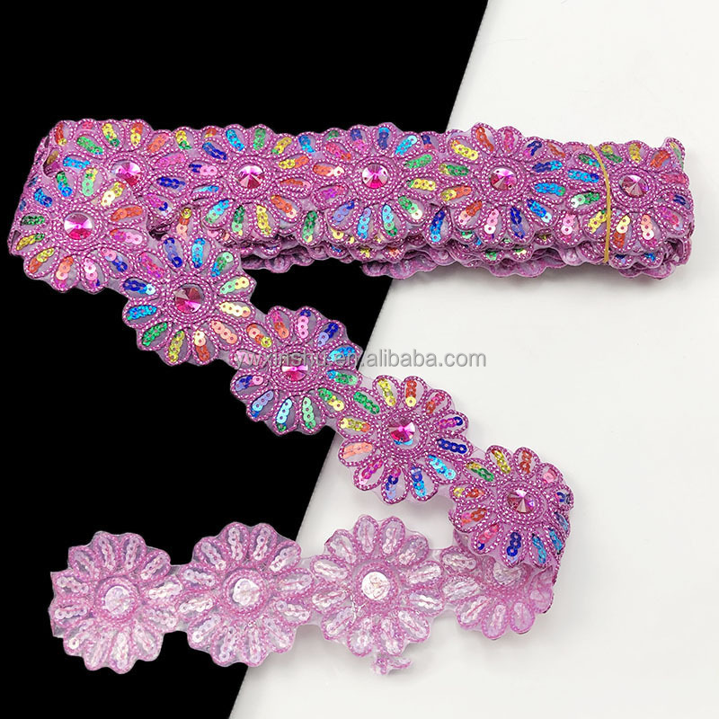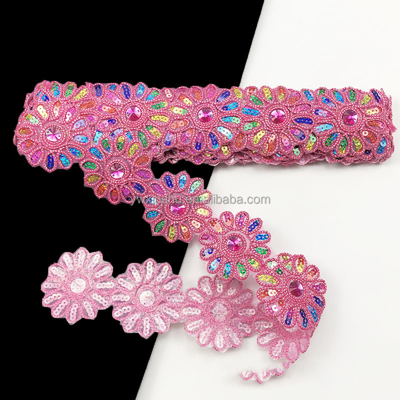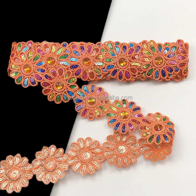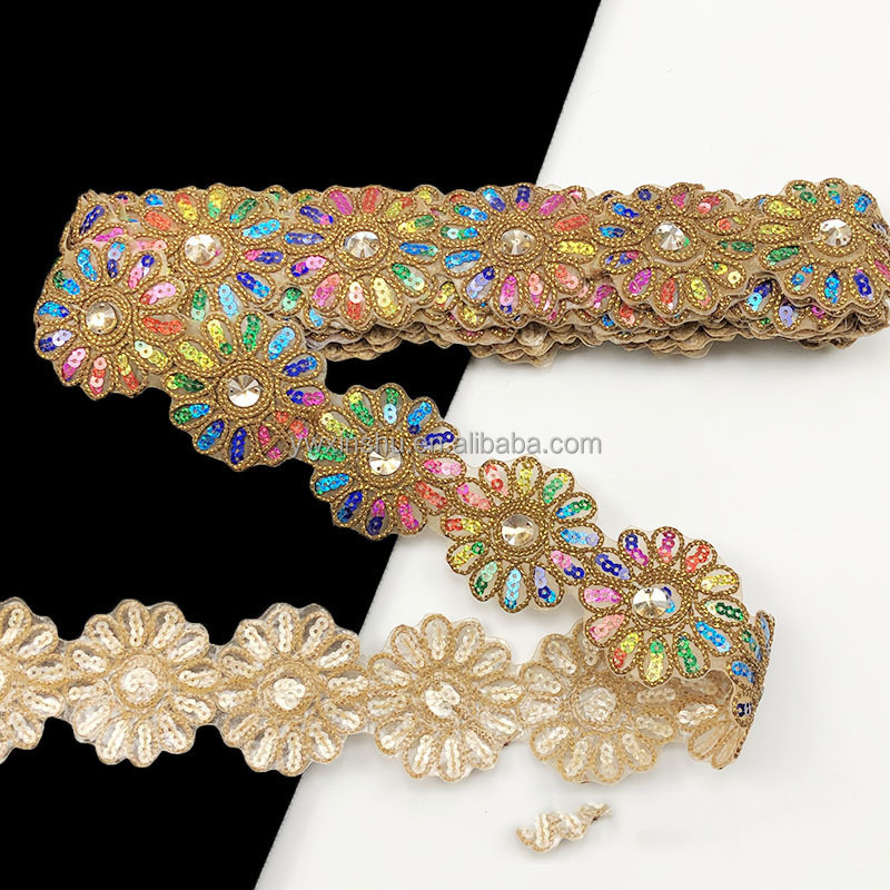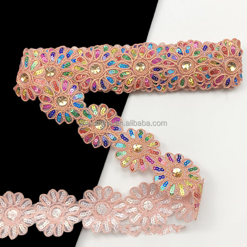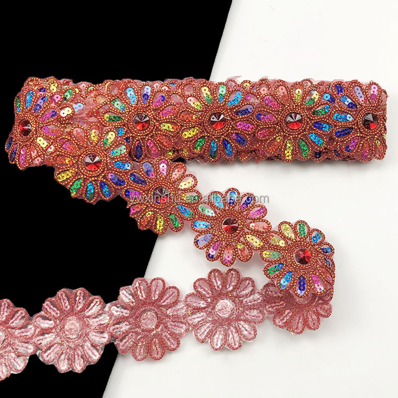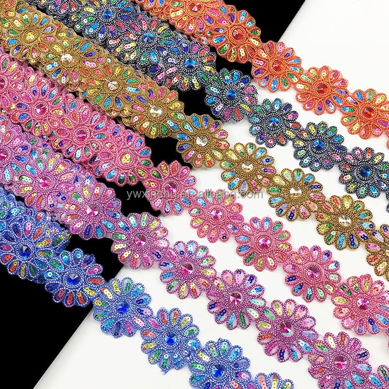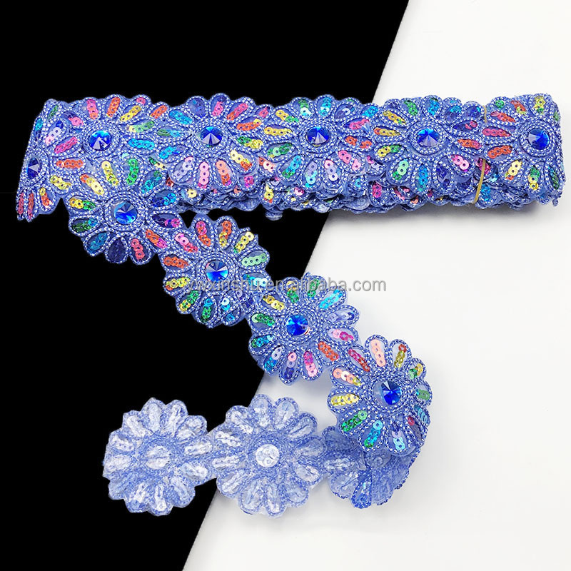 Hot Sale Beautiful Fashion Rhinestone Flower Sequined Embroidery Lace For Clothing Auxiliary Material Border Lace