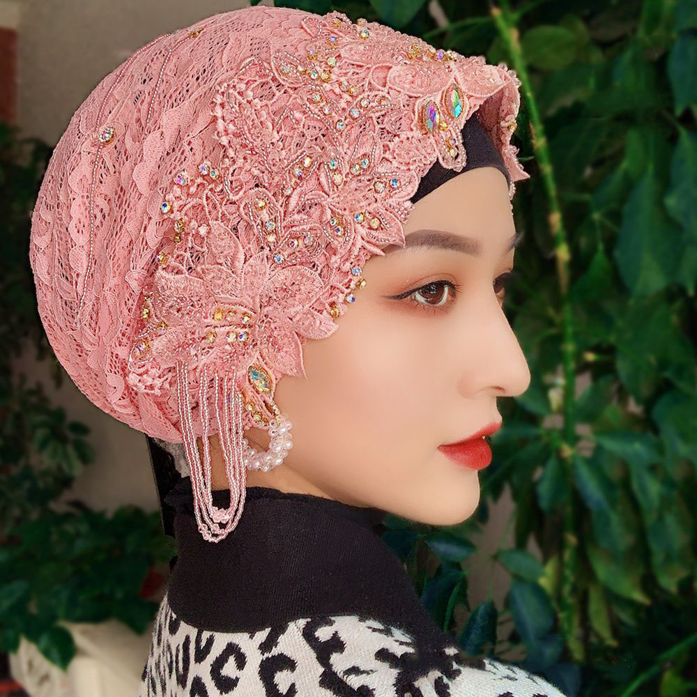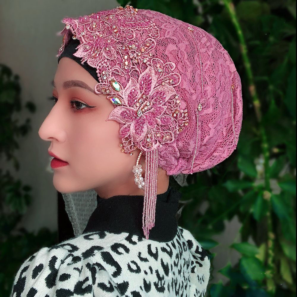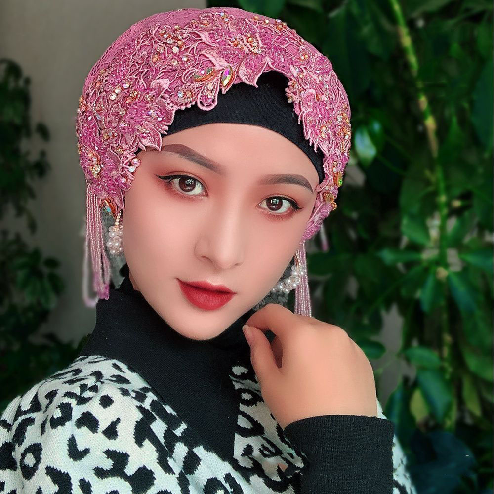 Moss scarf hat Malay style headscarf hand-beaded lace turban Hui hijab women