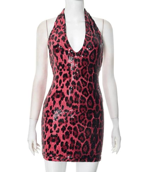 Sexy Sleeveless Halter Neck Leopard Print Sequined Deep V-neck Backpack Hip-revealing Dress