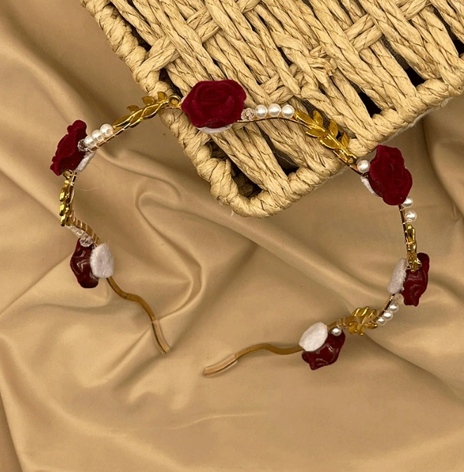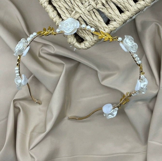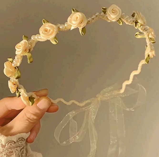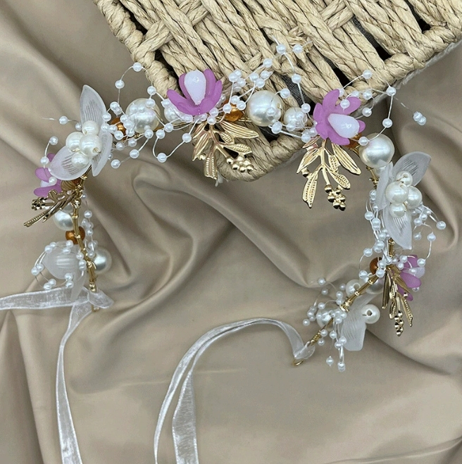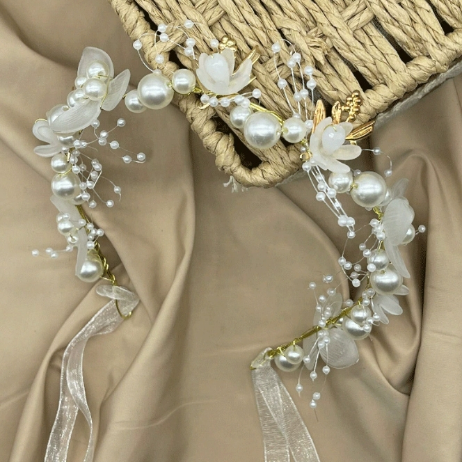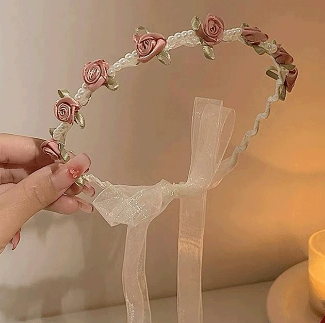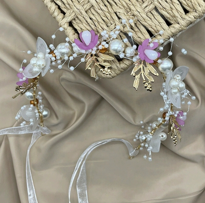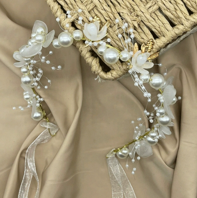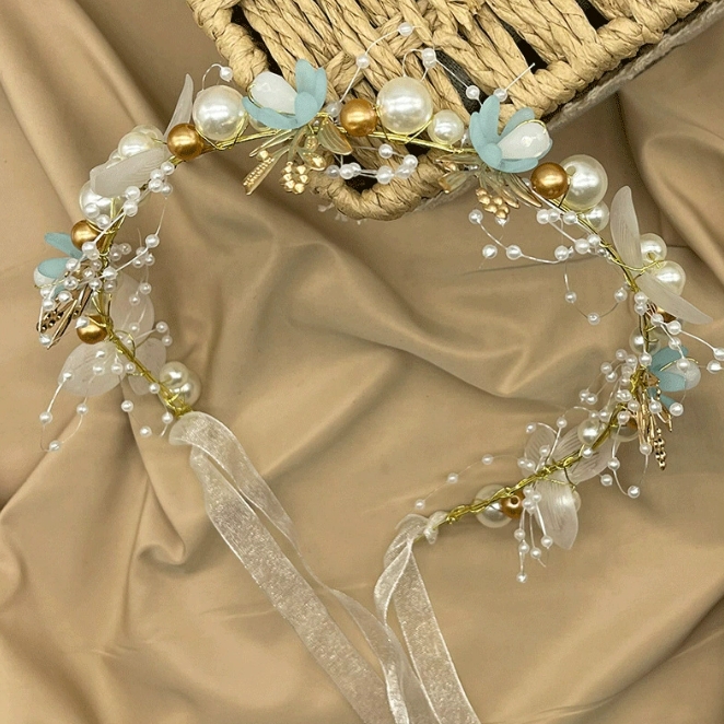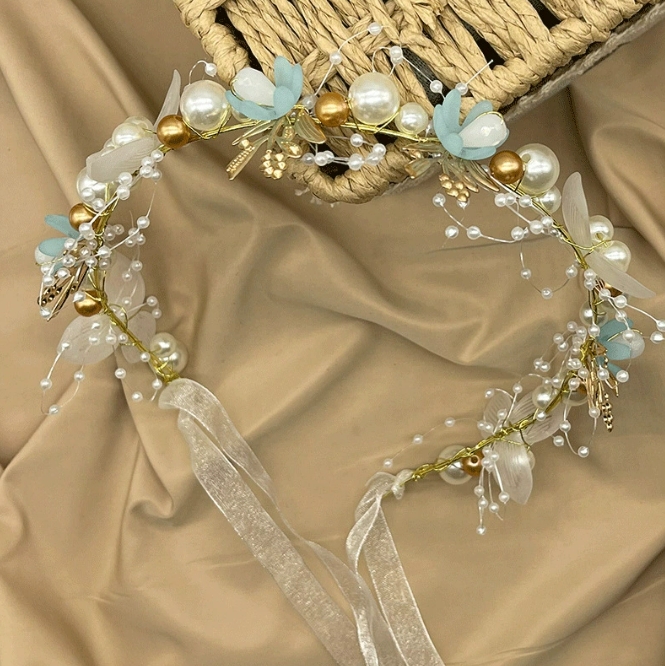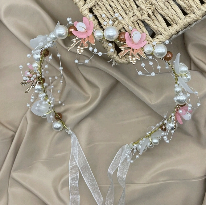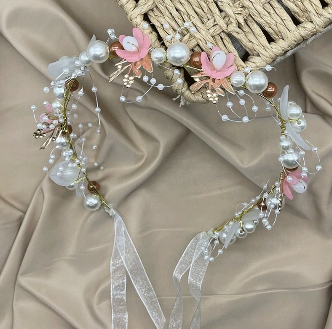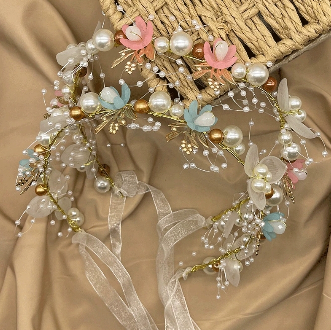 Flower Pearl Headband Adjustable Ribbon Garland Braided Headband Exquisite Princess Mesh Headband