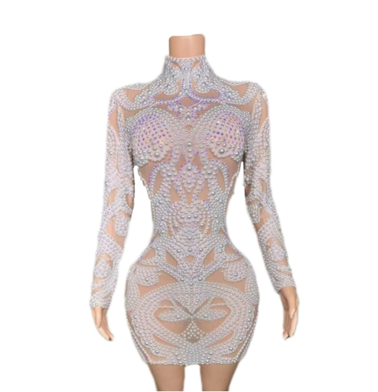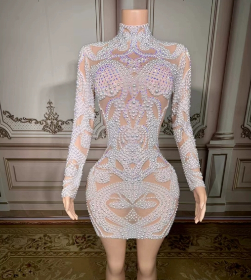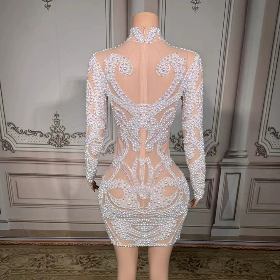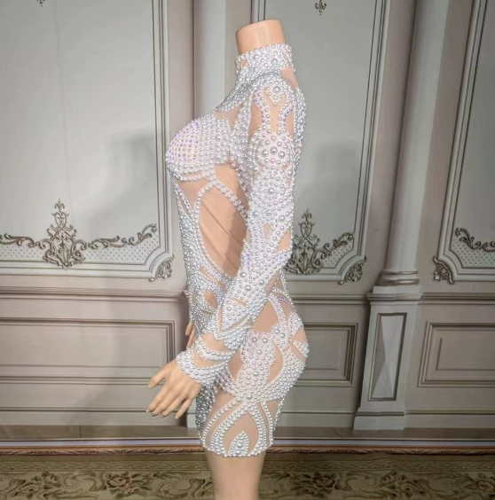 European and American Cross-border Hot Sale Pearl Mesh Half High Collar Tight Ultra-short Dress Mini Skirt Evening Dress