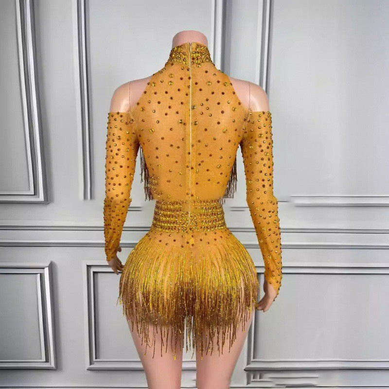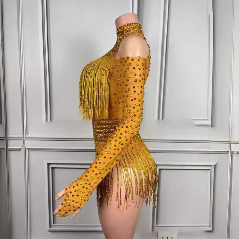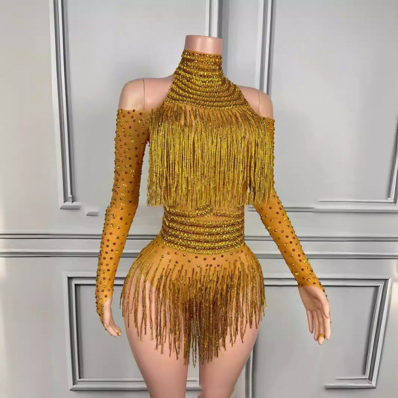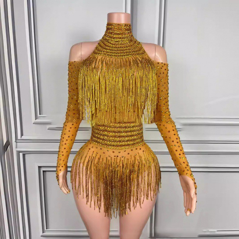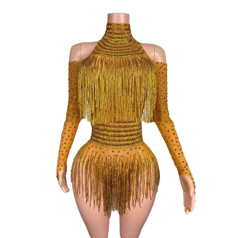 Performance costumes nightclub bar female group full diamond gold tassel jumpsuit singer dance team female group