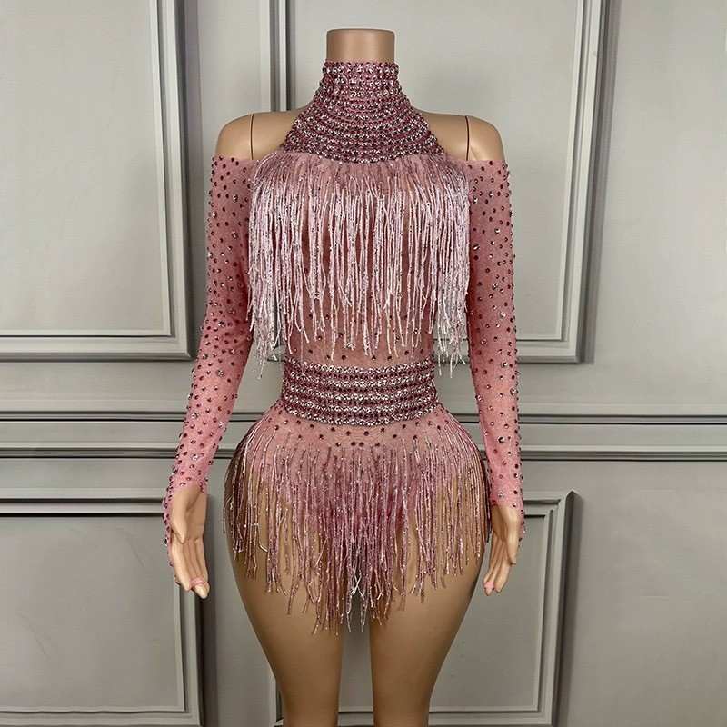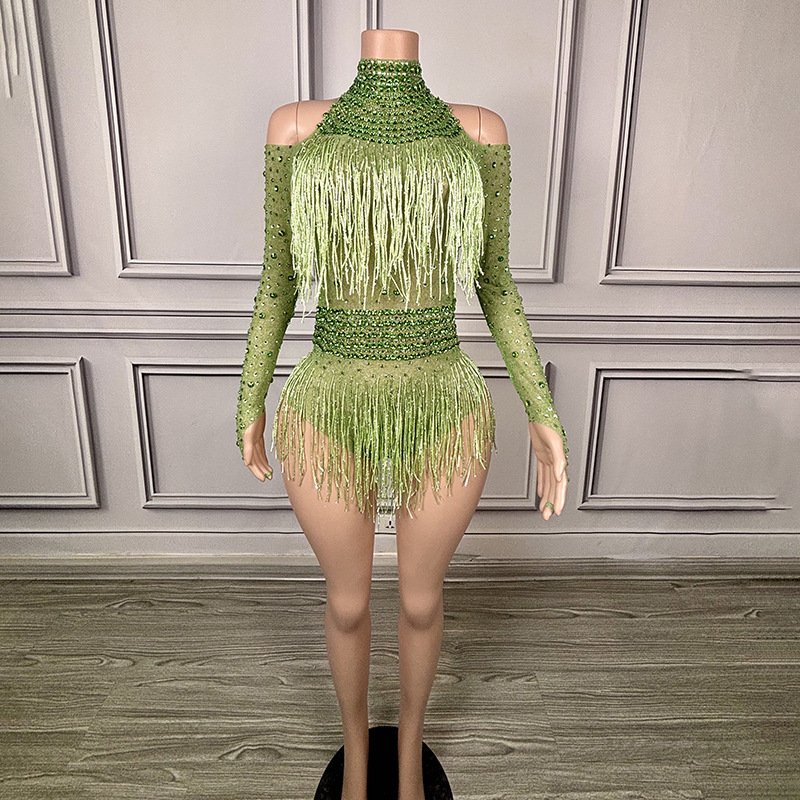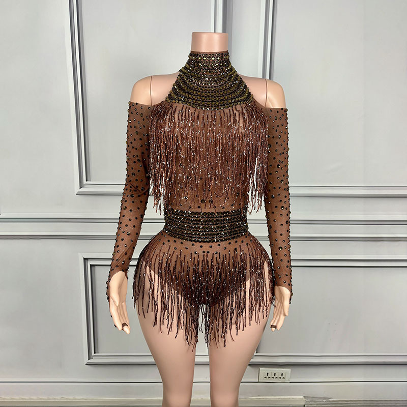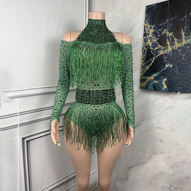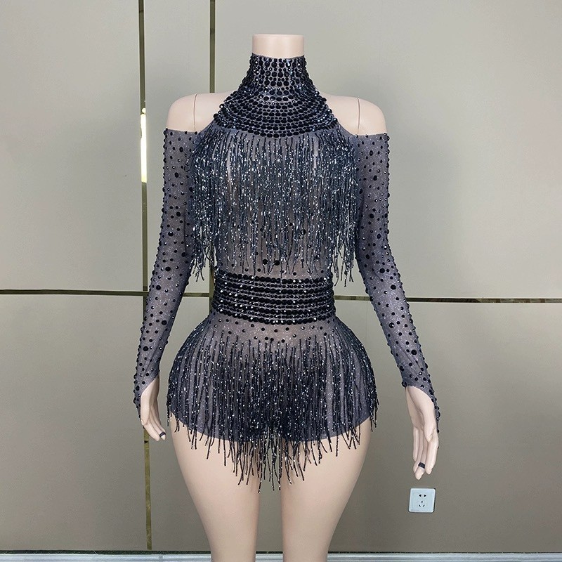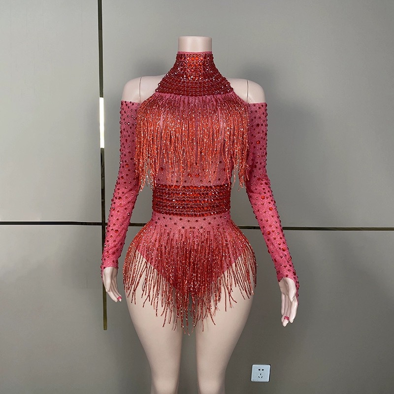 Performance costumes nightclub bar female group full diamond gold tassel jumpsuit singer dance team female group
