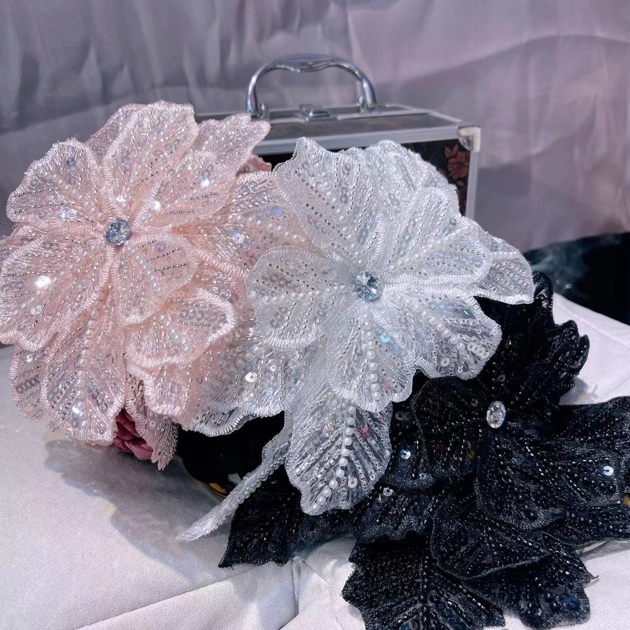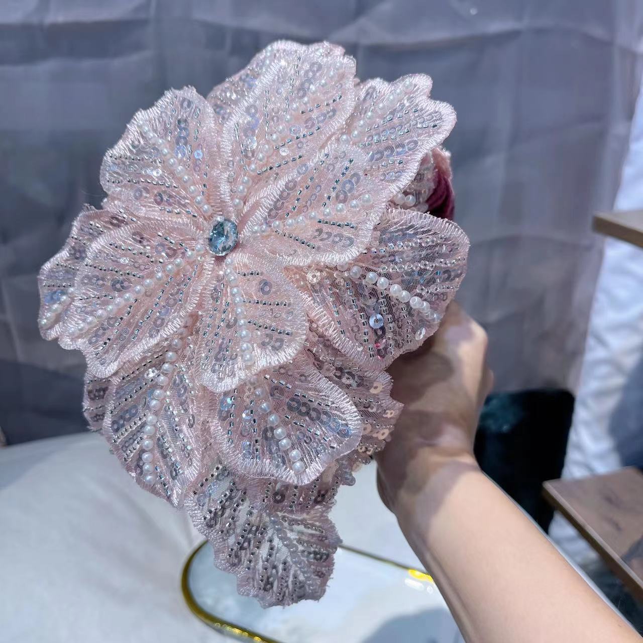 Oversized mesh, multi-layer sequins, nail beads, three-dimensional flowers personalized and stylish fashion headband