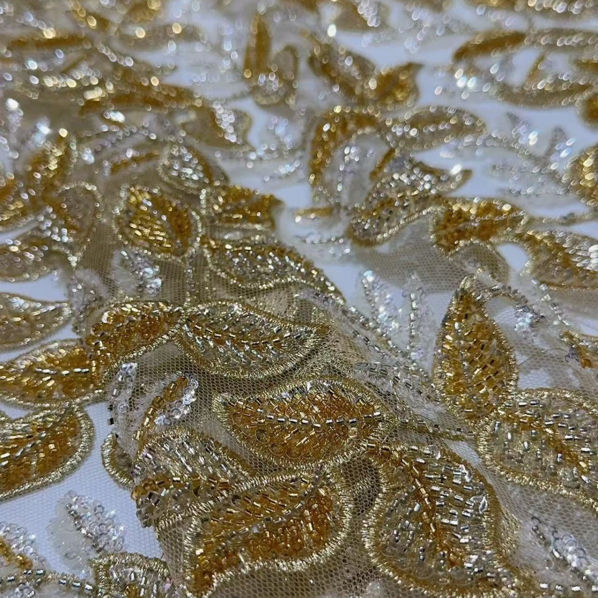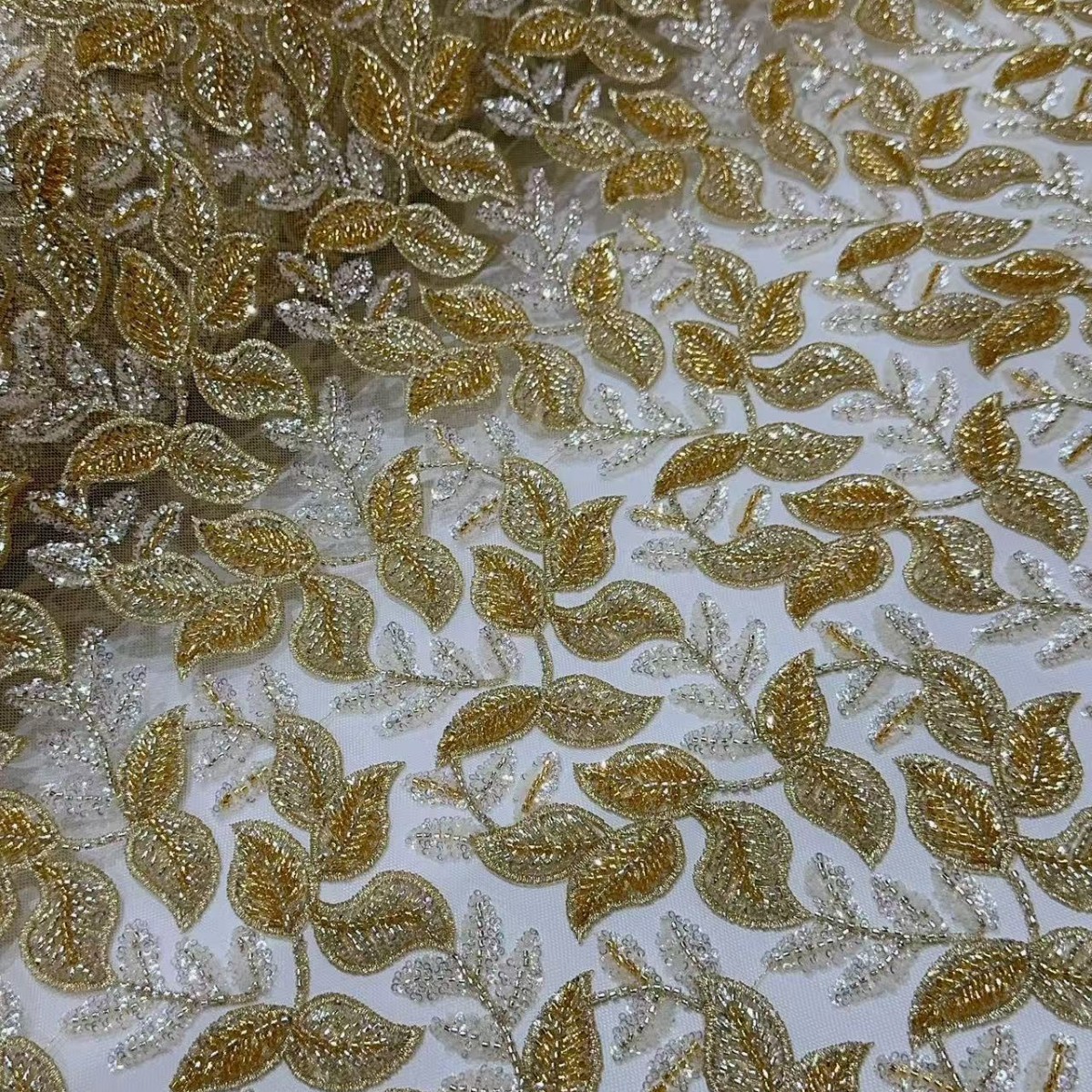 Cross-Border gold thread heavy industry beaded sequins leaves embroidered cloth dress dress wedding dress fabric lace fabric fabric