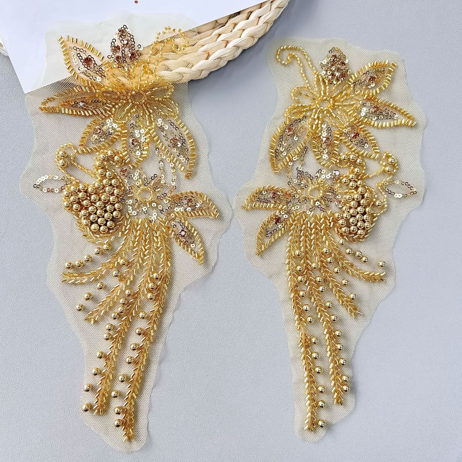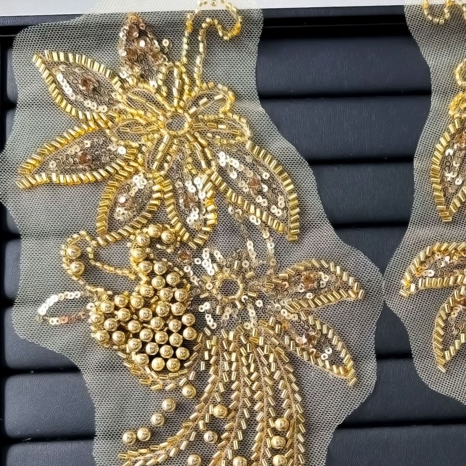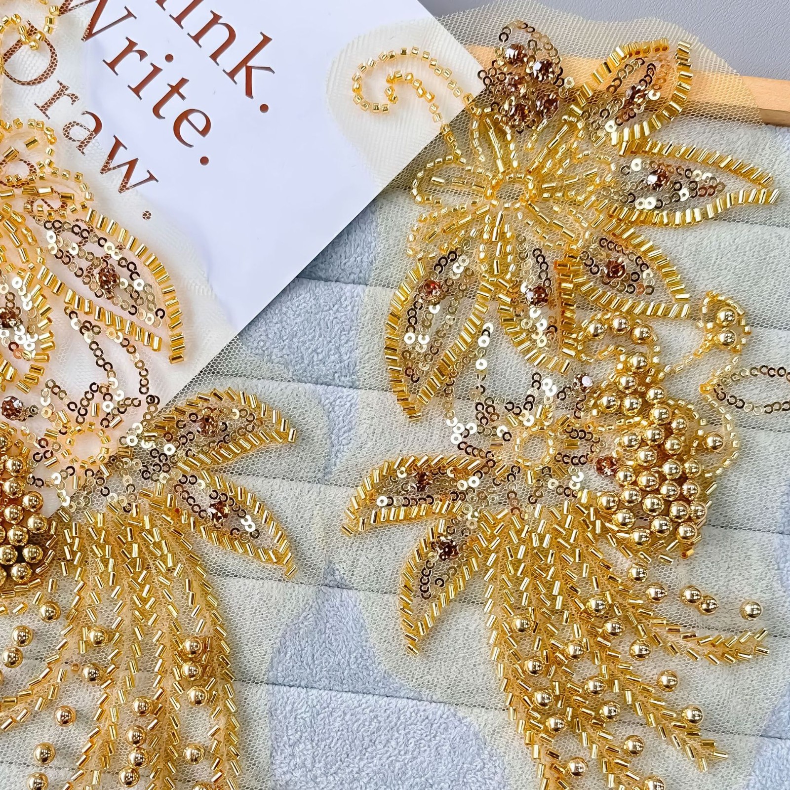 Gold heavy embroidery pearl bead tube sequins cloth patch wedding dress applique ethnic style