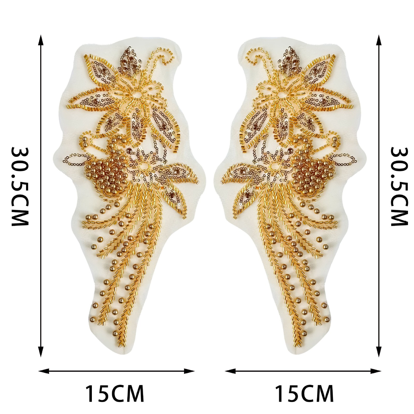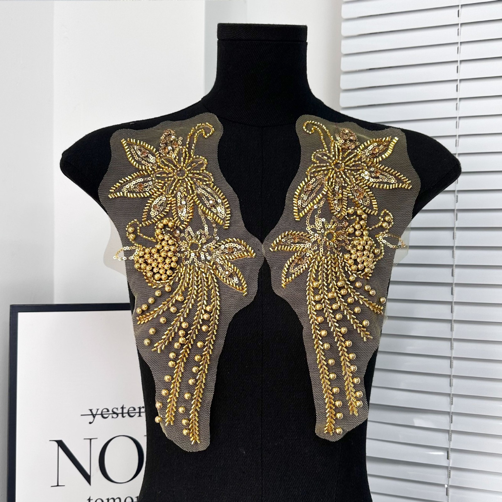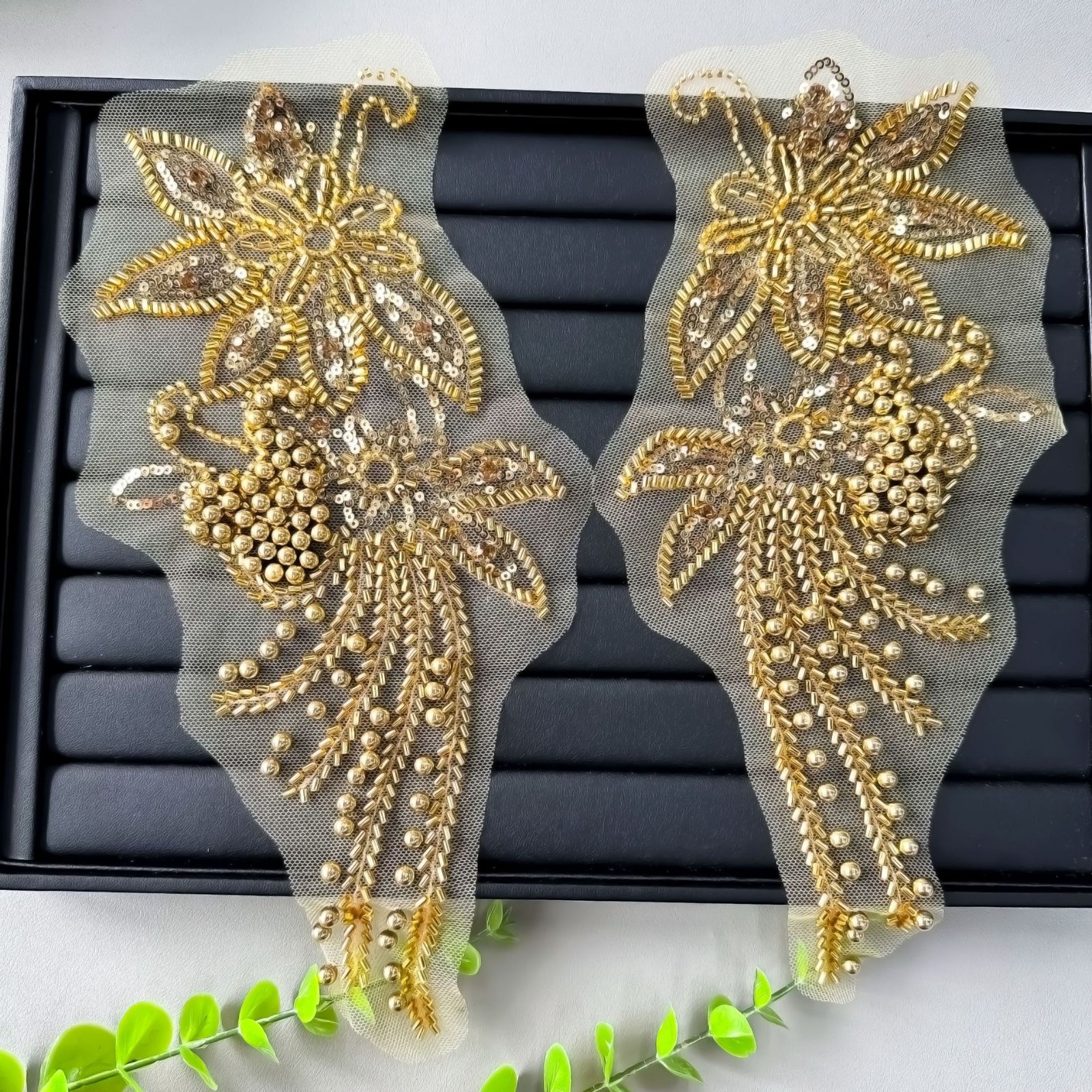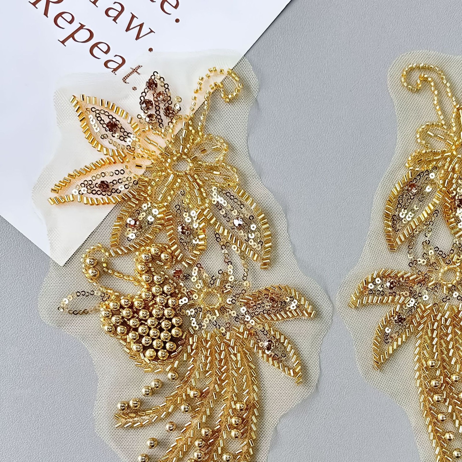 Gold heavy embroidery pearl bead tube sequins cloth patch wedding dress applique ethnic style