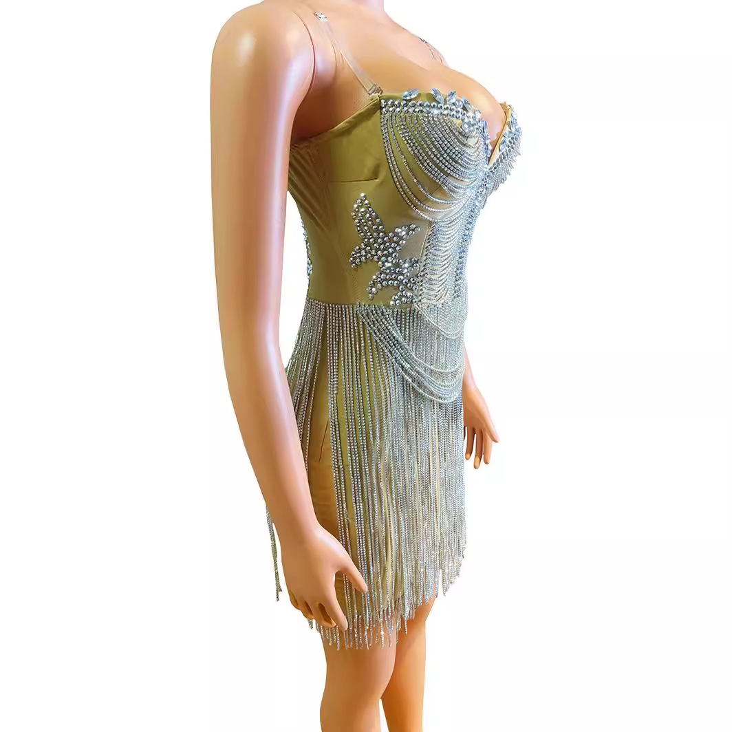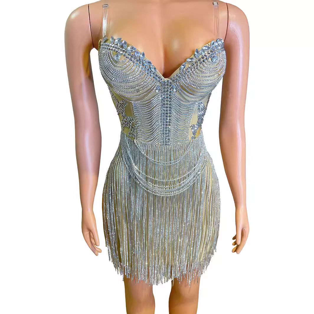 2025 New Arrival Strapless Sparkling Diamond Mini Skirt Rhinestone Tassel Club Party Evening Dress