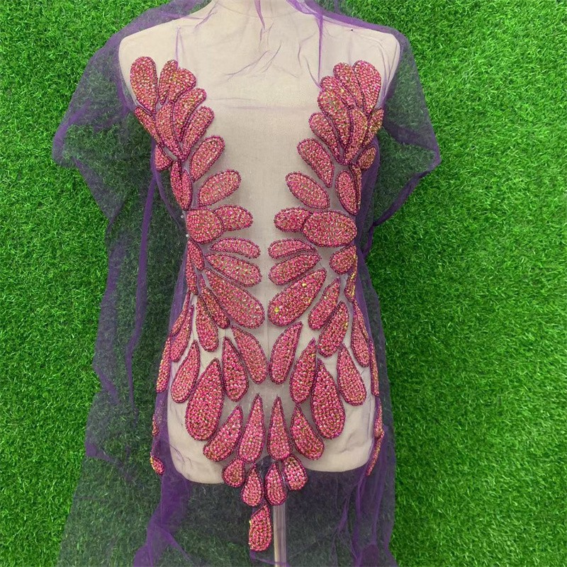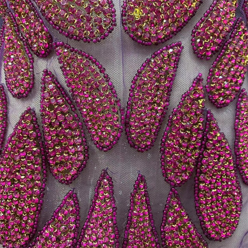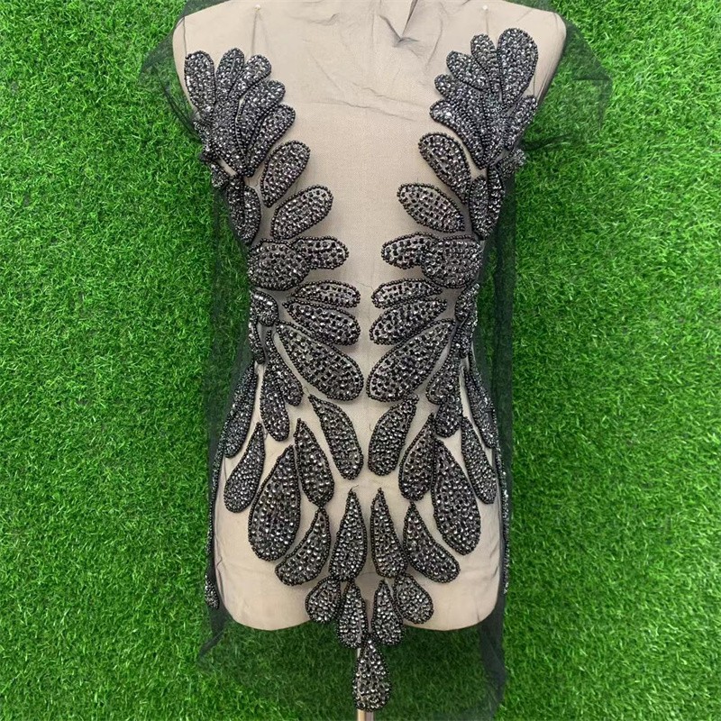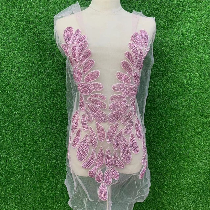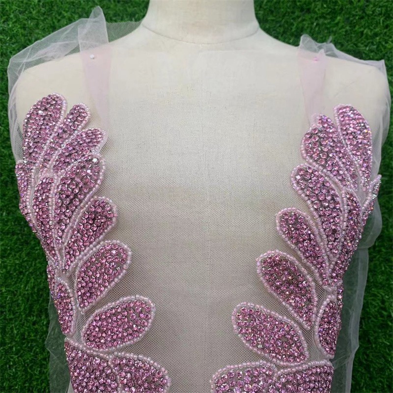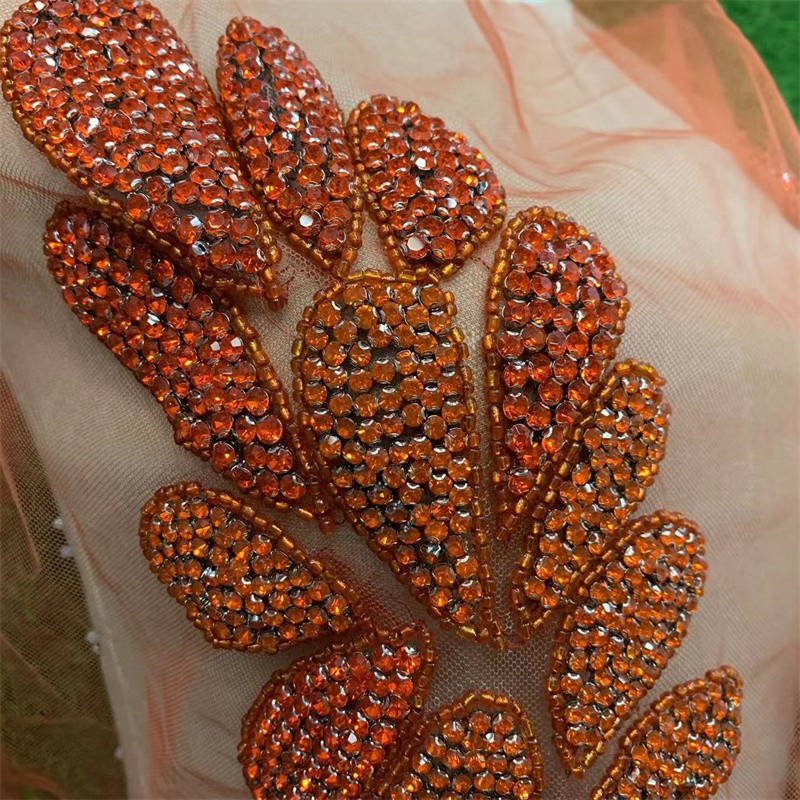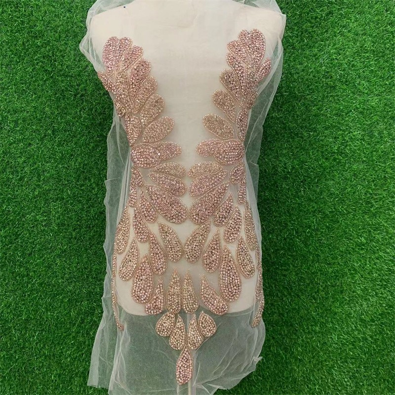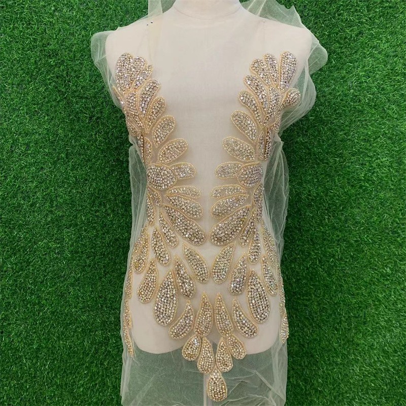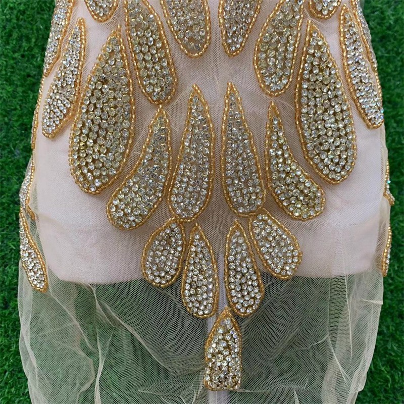 Gold front handmade beaded wedding dress with brooch mesh applique